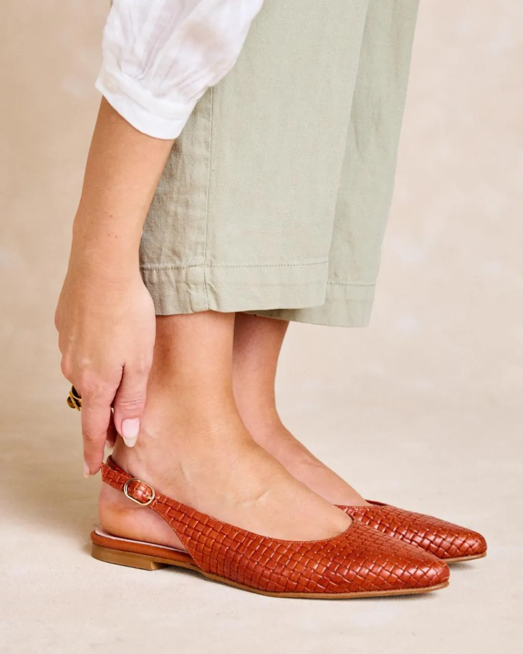 Ballerines escarpins arrière en cuir tressé de couleur caldeira. Bout pointu. à lanière talon. C’est une chaussure différente et confortable à combiner avec des pantalons et des robes.