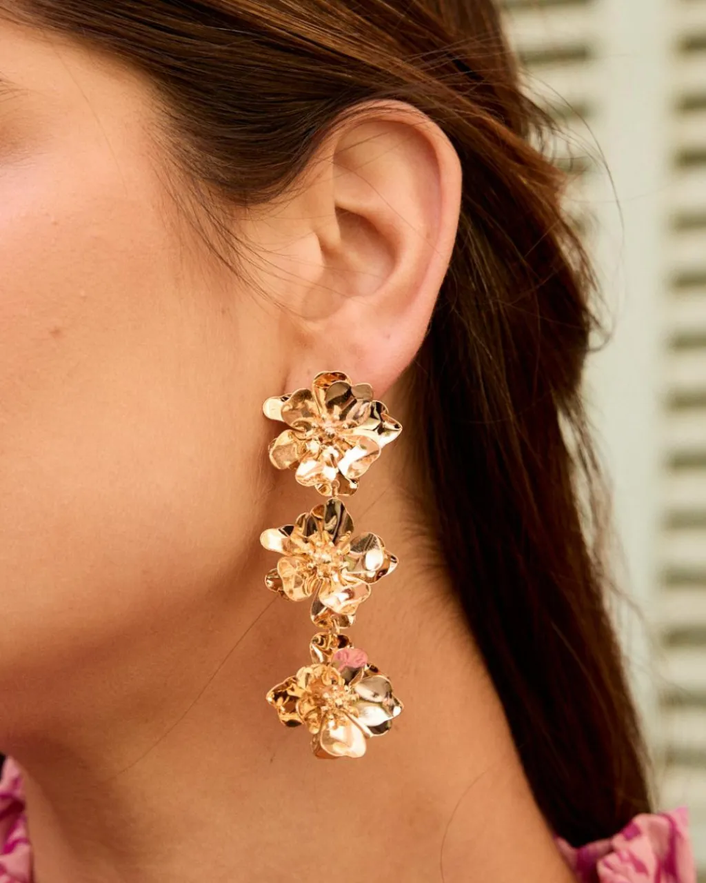 Longue boucle d’oreille en or avec trois pendentifs de fleurs métalliques.