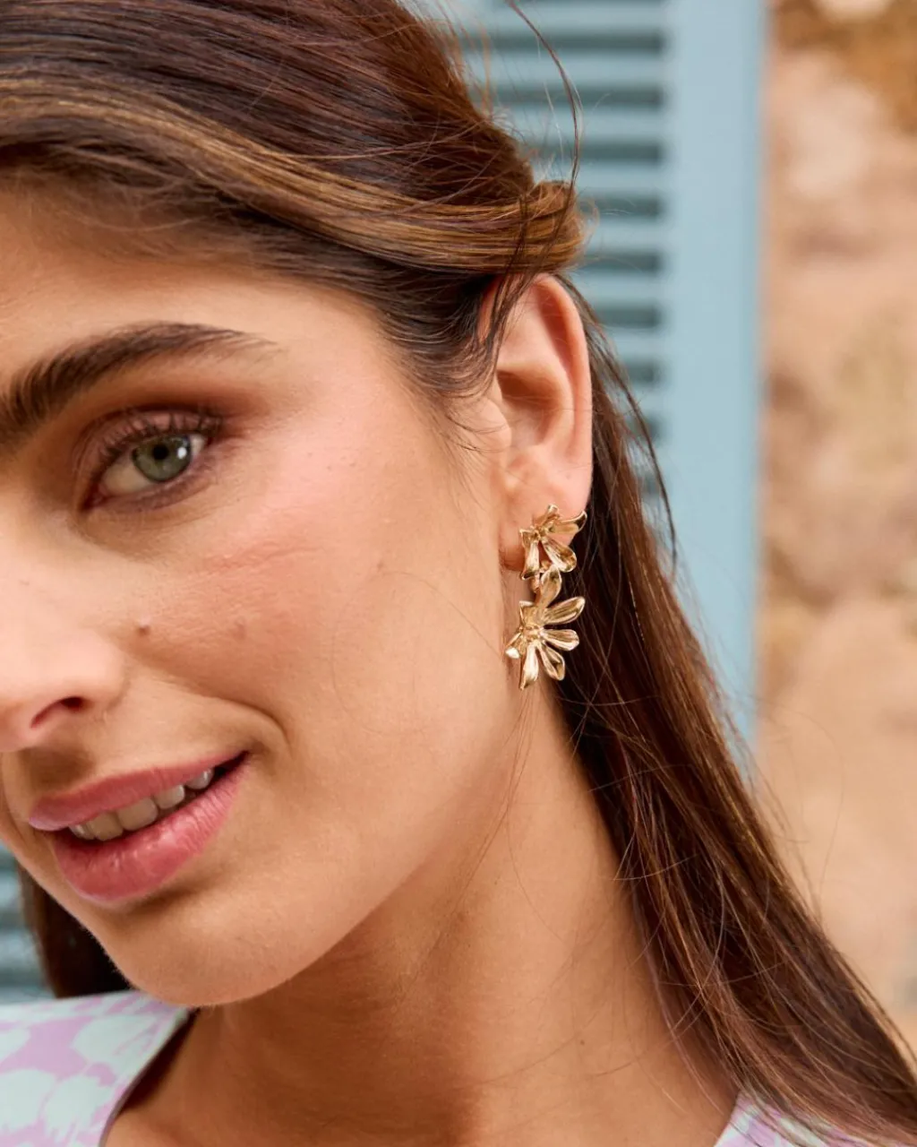 Boucles d’oreilles en or en forme de fleurs métalliques superposées.