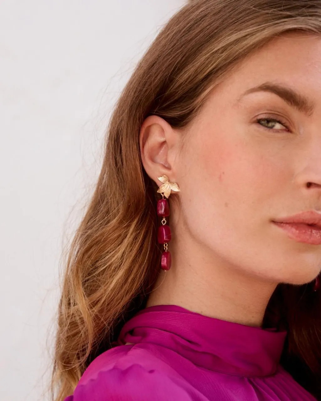 Boucles d’oreilles en résine dans le ton cerise avec des détails dorés.