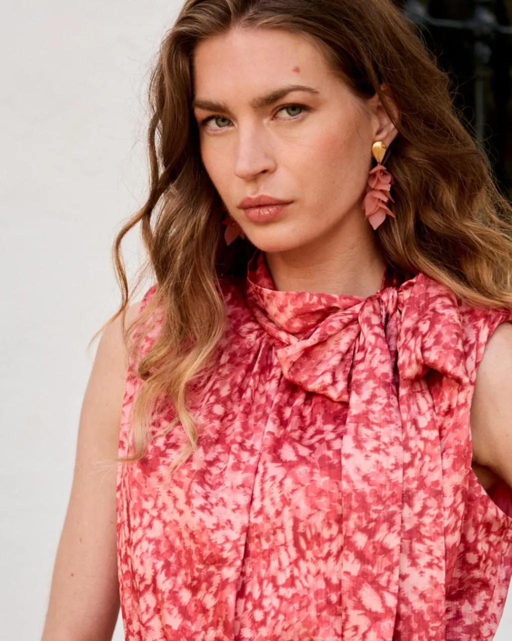 Boucles d’oreilles avec détails suspendus dans le ton du maquillage et des détails dorés.