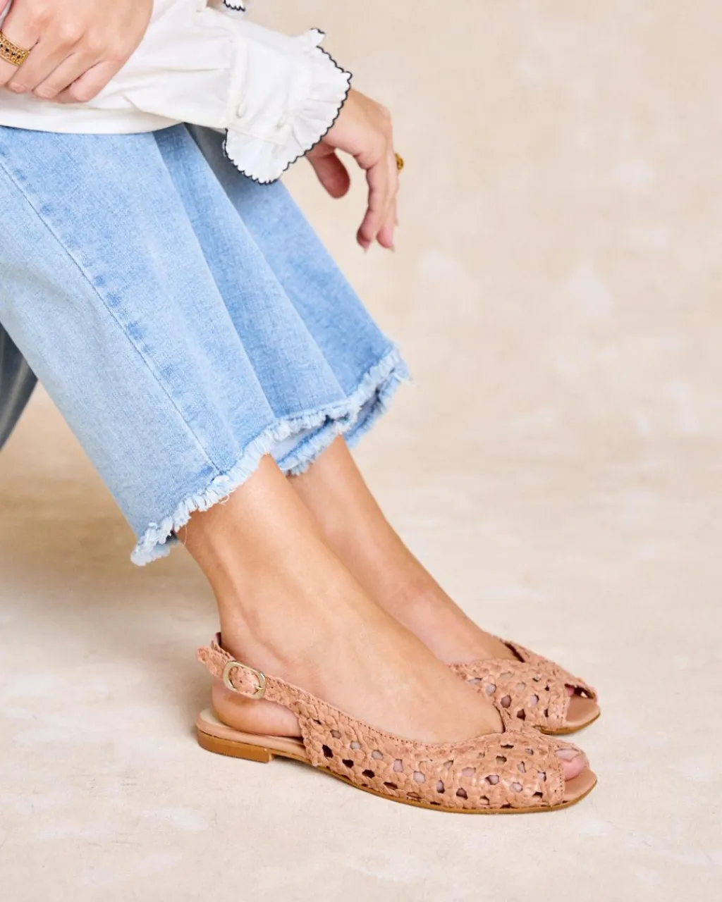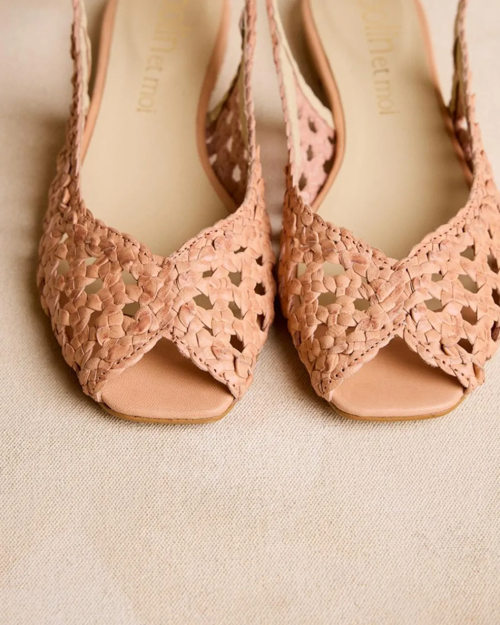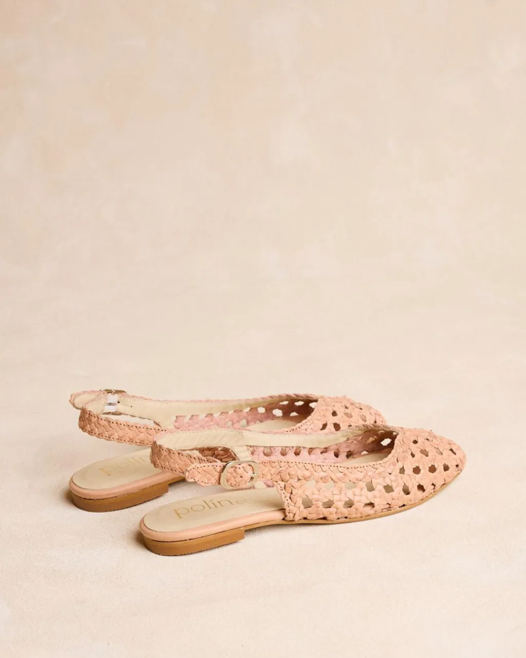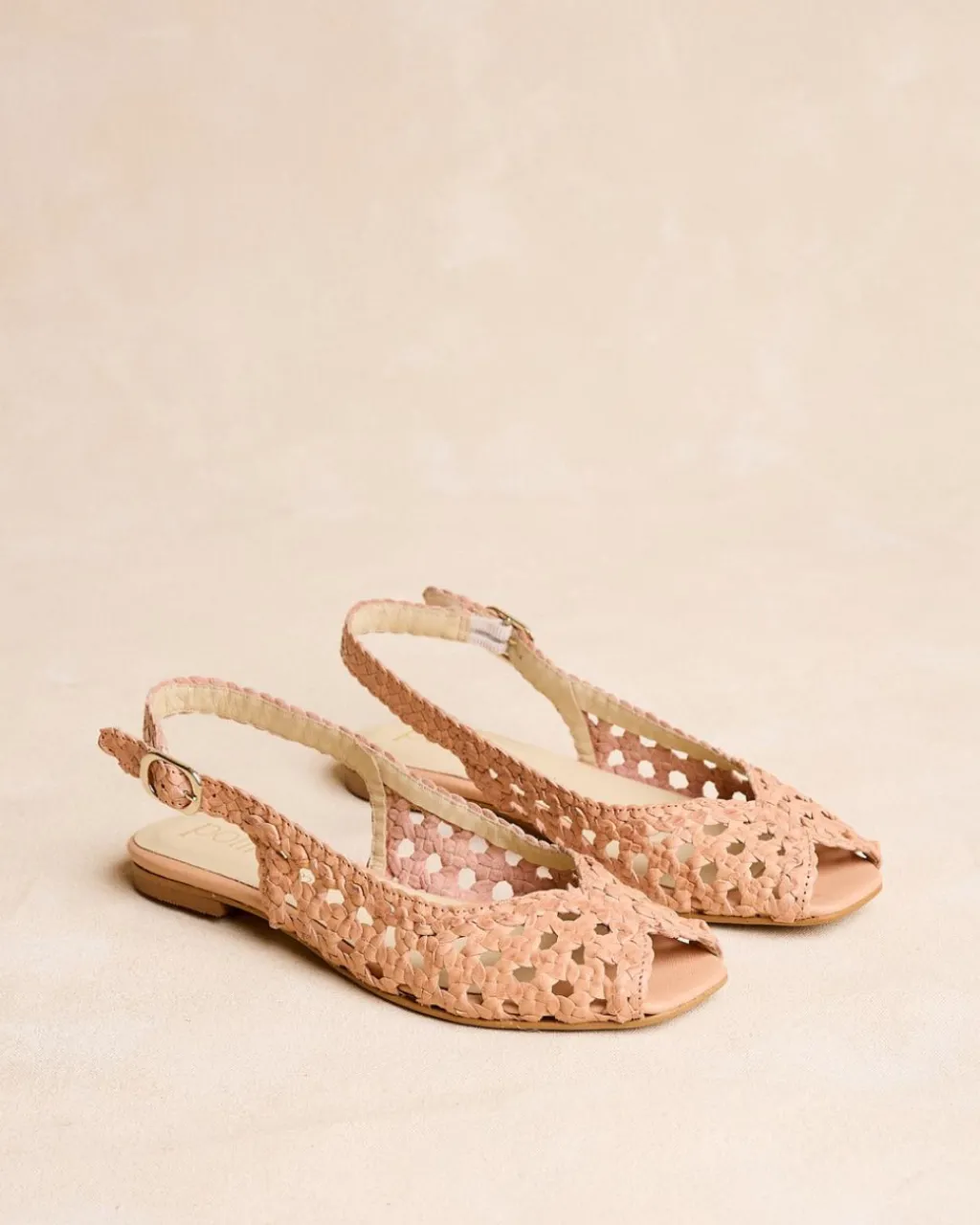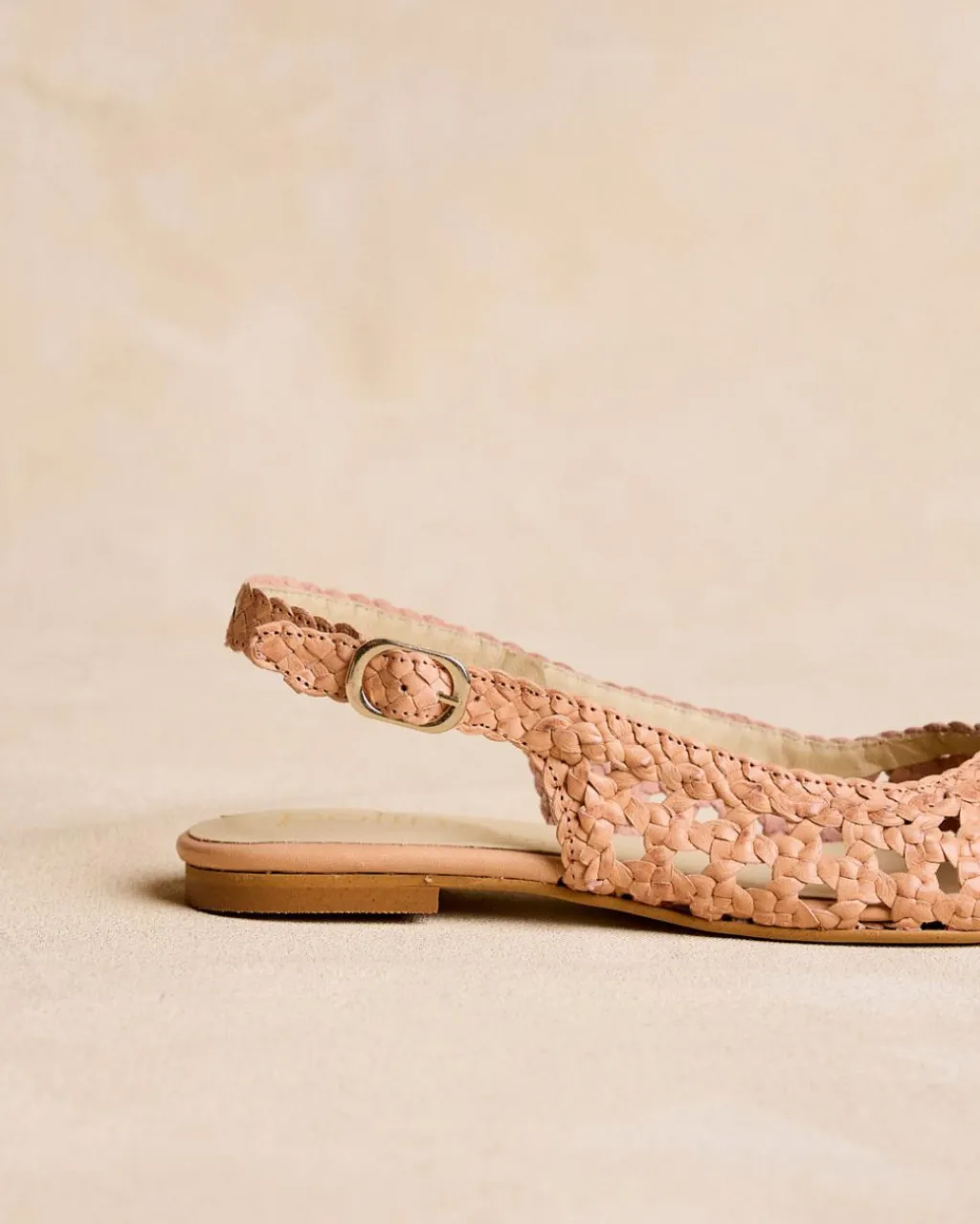 Chaussure plate en cuir tressé de couleur sable. Encolure papillon. Modèle à bride arrière avec bride en cuir tressé avec boucle pour un meilleur ajustement. Une chaussure confortable et très féminine à porter au quotidien.