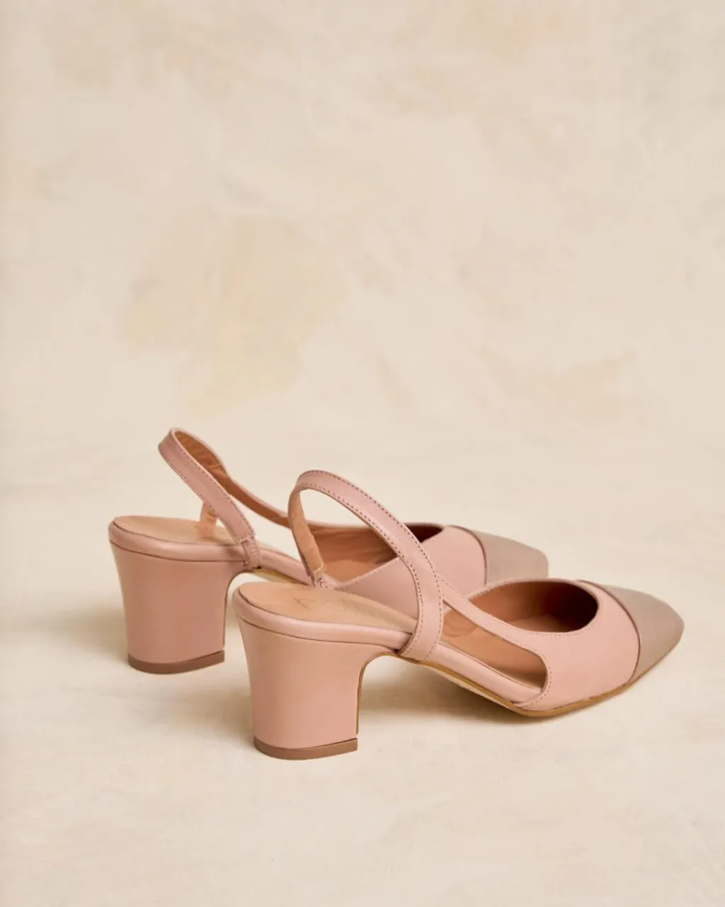 Chaussure à talon en cuir, bicolore : moka et nude. Chaussure à bride arrière. Pointe légèrement carrée d’une autre couleur. Encolure arrondie. Sur la pointe, il a une coupe diagonale. Une chaussure élégante et confortable.