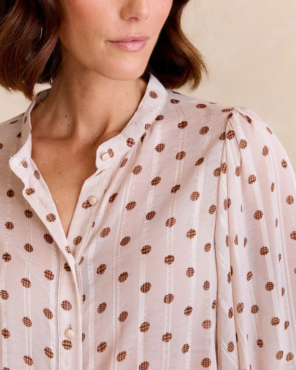 Chemise écrue à imprimer à pois, coupe fluide et col rond. Comprend des manches longues et une fermeture à petits boutons, parfaite pour un style confortable