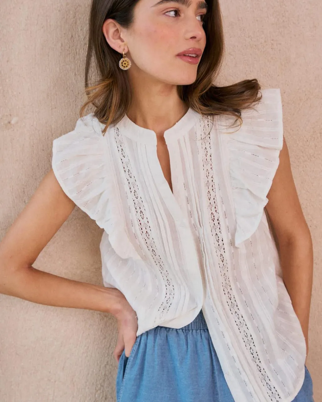 Chemise blanche à volants sur les épaules et détails ajourés sur le devant, design sans manches et tissu léger.