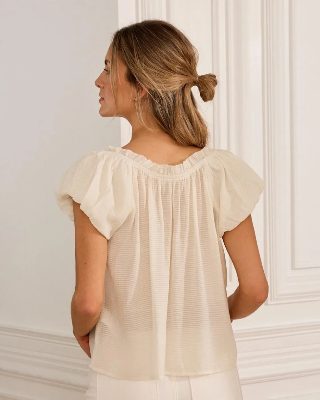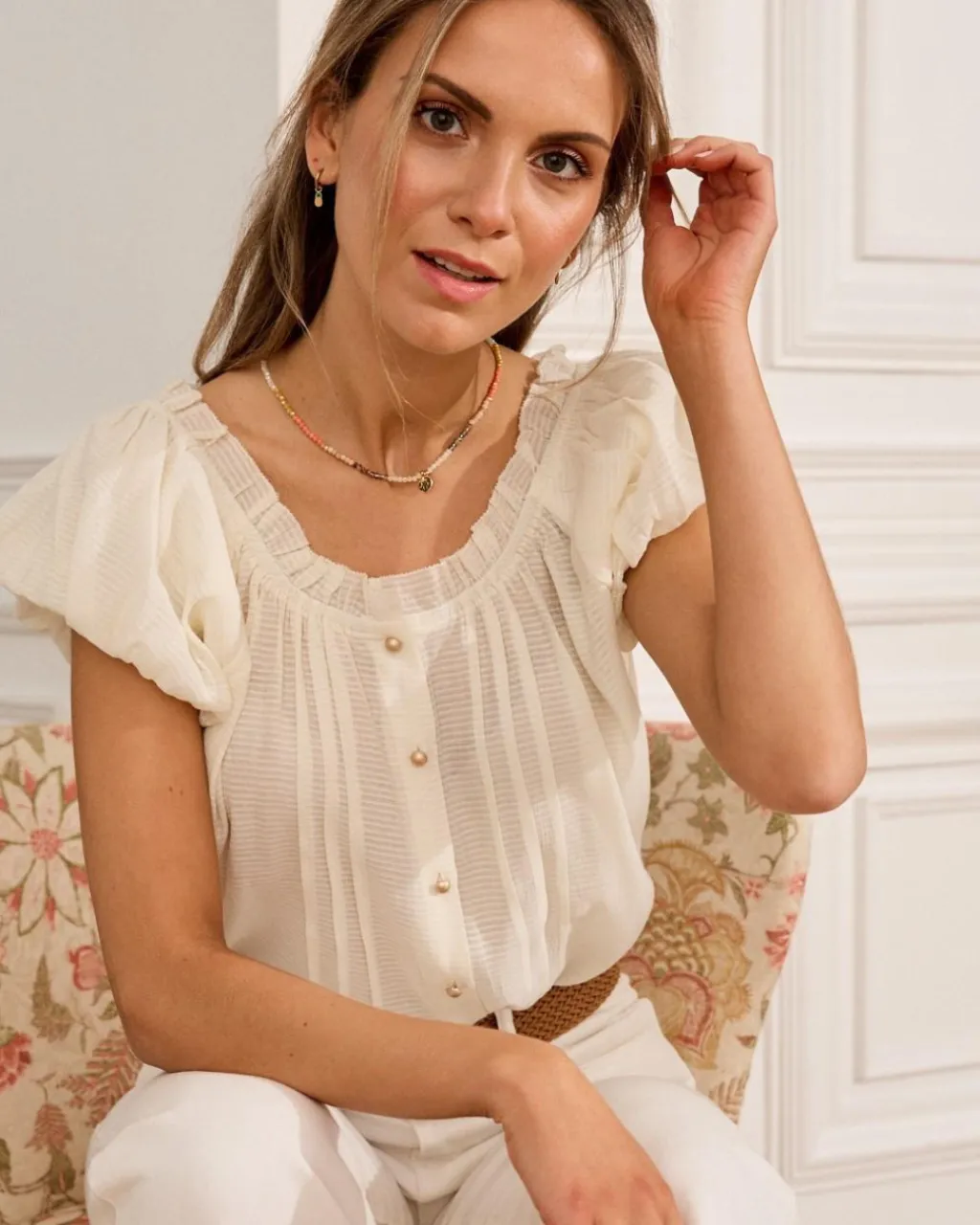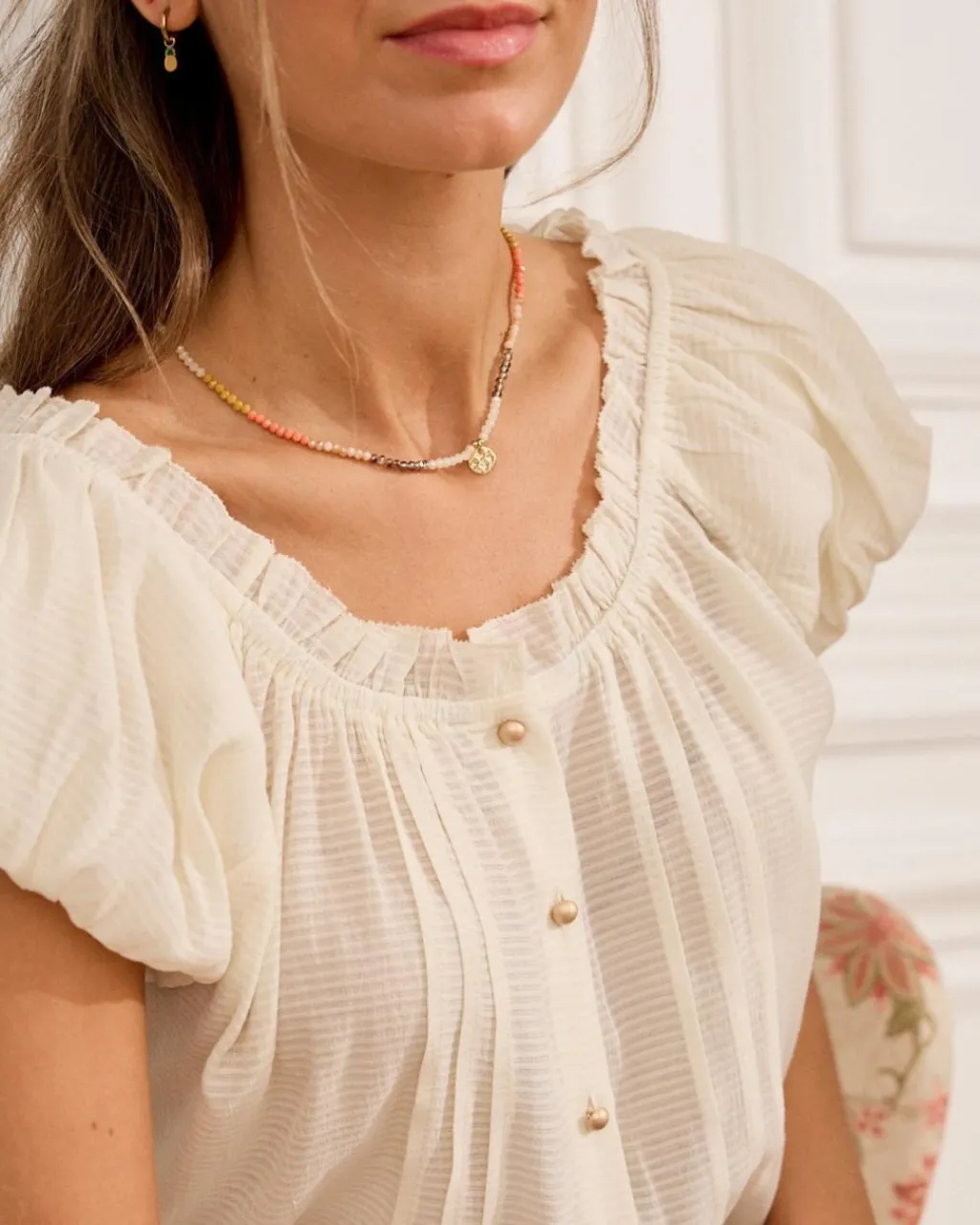 Chemisier dans le ton brut, manches courtes bouffantes avec élastique. Col rond avec des détails à volants suivi d’une rangée de boutons dorés tout en bas. Corps droit. Chemisier romantique et parfait pour un usage quotidien.