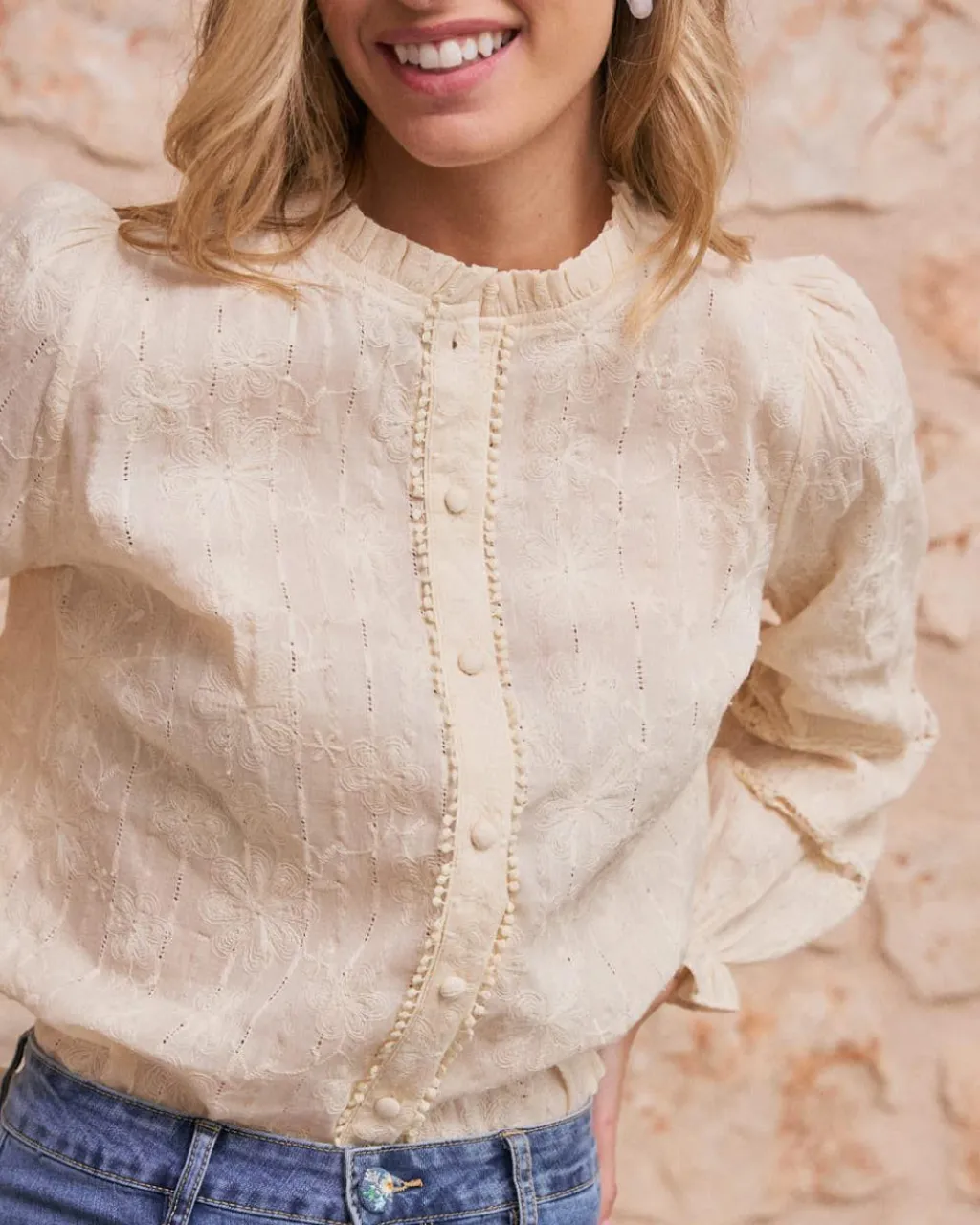 Chemisier de couleur crème avec broderie de dentelle, texture subtile et détails ajourés. Il présente une rangée de boutons sur le devant et des manches longues avec des finitions décoratives.