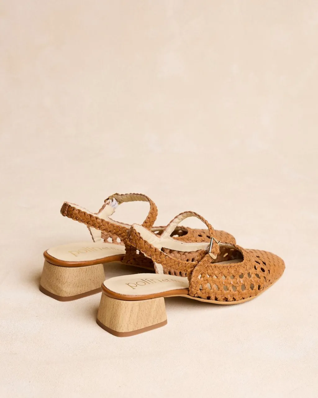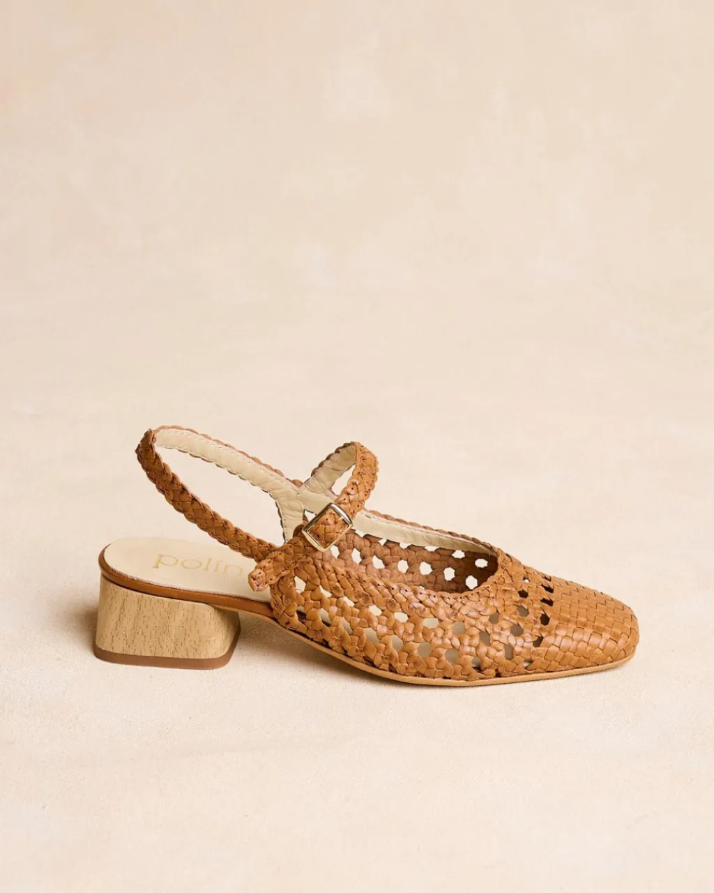 Chaussure de couleur cuir avec un motif tressées sur la tige, offrant un style artisanal et sophistiqué. Il est doté d’un large talon effet bois qui offre confort et stabilité. La fermeture comprend une boucle latérale réglable pour un ajustement sûr. Parfait pour compléter les looks décontractés avec une touche élégante et naturelle.