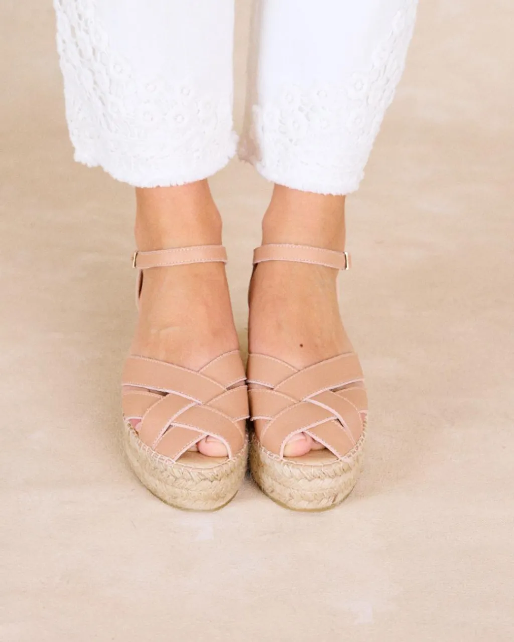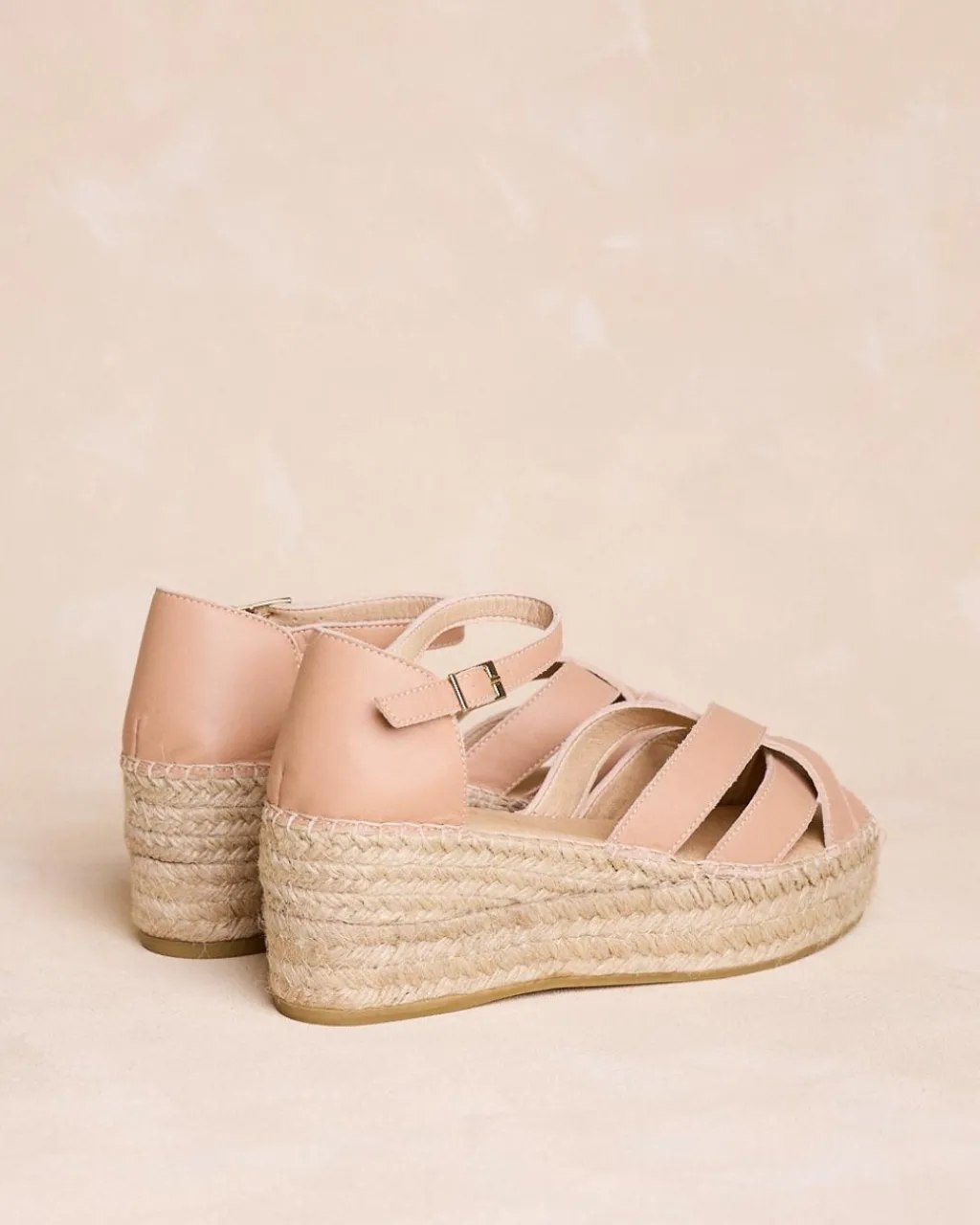 Espadrille de couleur maquillage. Bout arrondi semi-ouvert. Encolure à plusieurs bretelles qui permet de voir le pied. Fermeture du cou-de-pied avec fines bretelles à boucle. La semelle intérieure est dotée d’un coussinet pour plus de confort. Une sandale confortable, pour rehausser n’importe quel look cette saison.