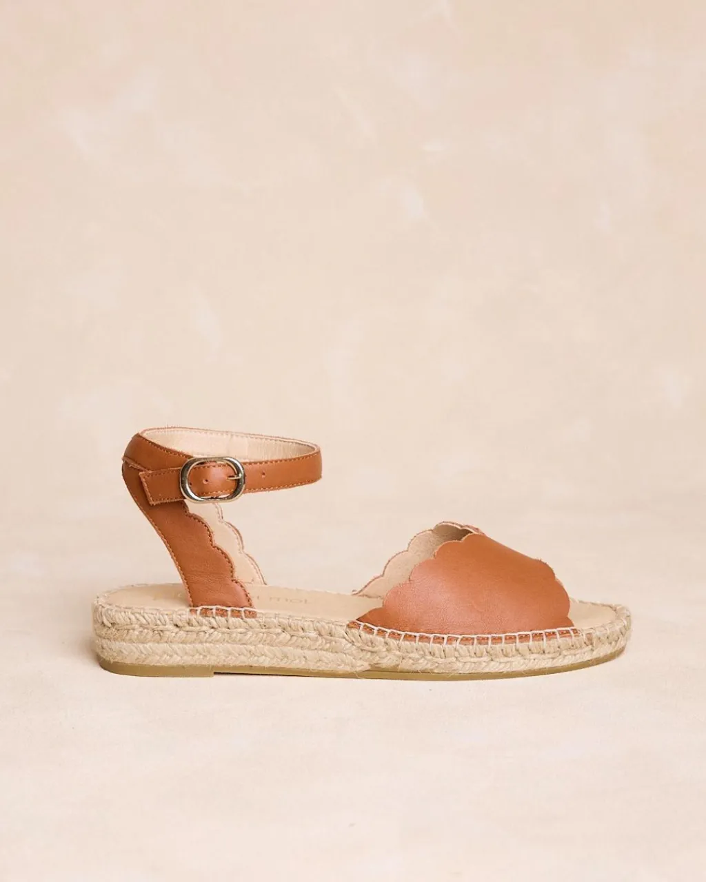 Espadrilles en cuir avec semelle en jute et bracelet de cheville réglable. Son design supérieur ondulé ajoute une touche élégante et polyvalente, idéale pour un look frais et naturel.