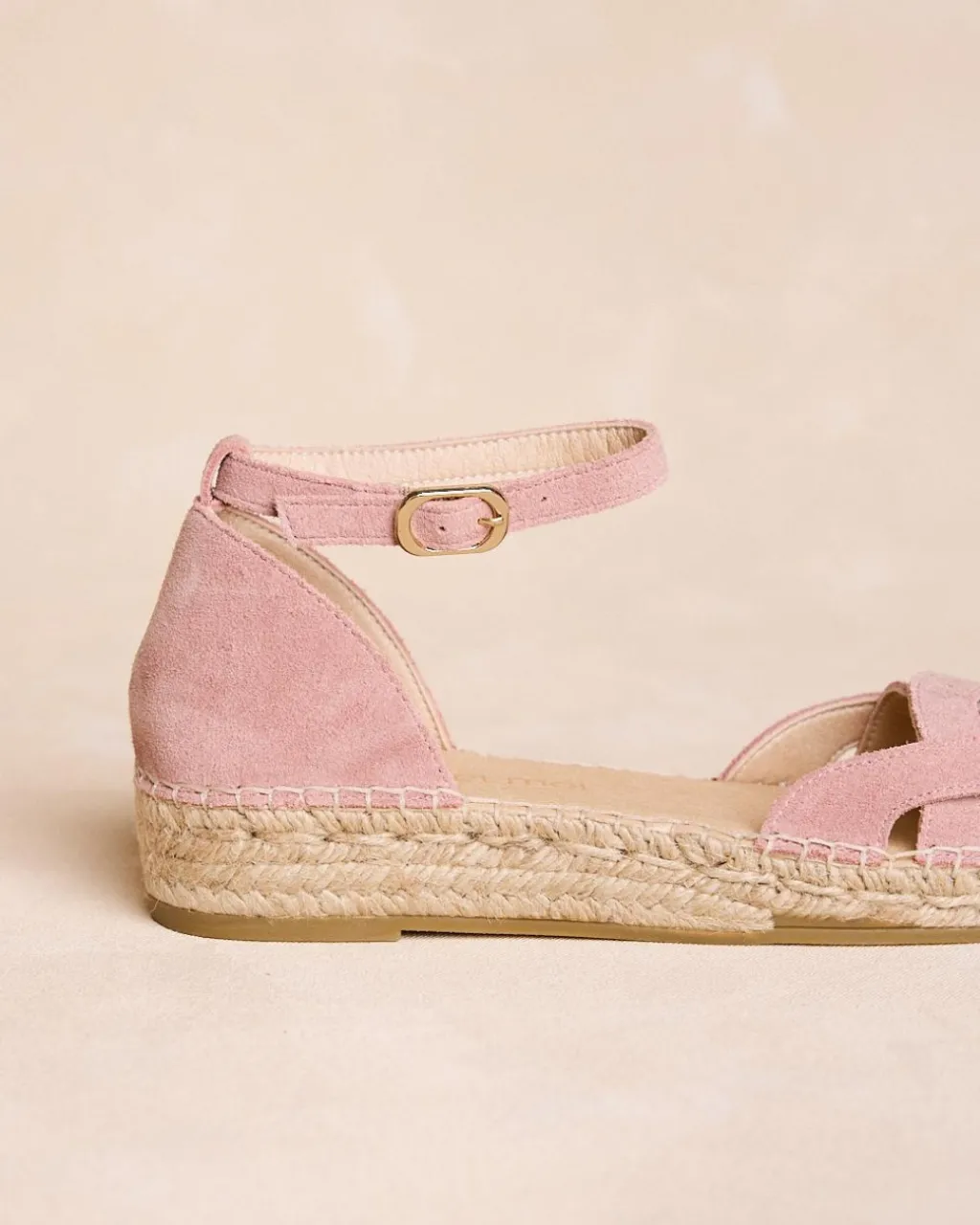 Espadrilles de couleur maquillage avec semelle en jute et tige croisée. Ils ont un bracelet de cheville réglable qui offre un soutien et une touche féminine, parfait pour des looks frais et délicats.