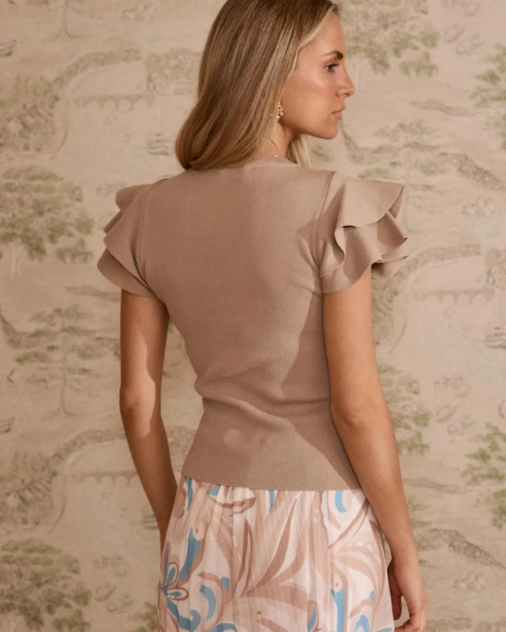 Haut en maille à la coupe ajustée et élégant dans un ton beige. Ses manches à volants ajoutent une touche sophistiquée et féminine. Polyvalente et facile à combiner avec des jupes ou des pantalons pour un look chic et intemporel.