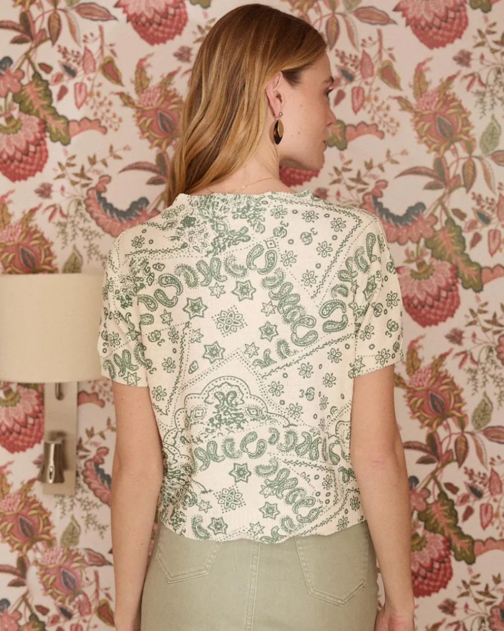 Haut en maille dans les tons verts. Confectionné dans un tissu léger et frais, il est parfait pour un look décontracté avec une touche bohème.