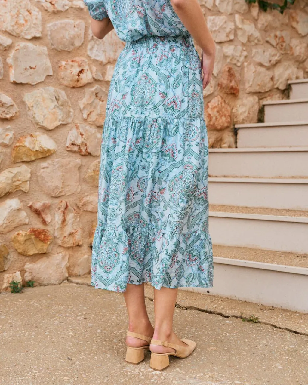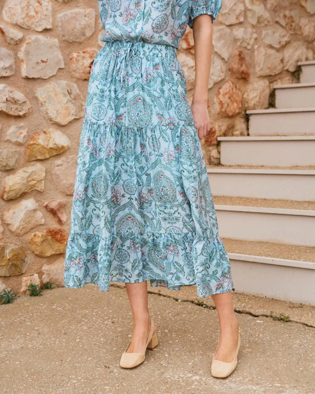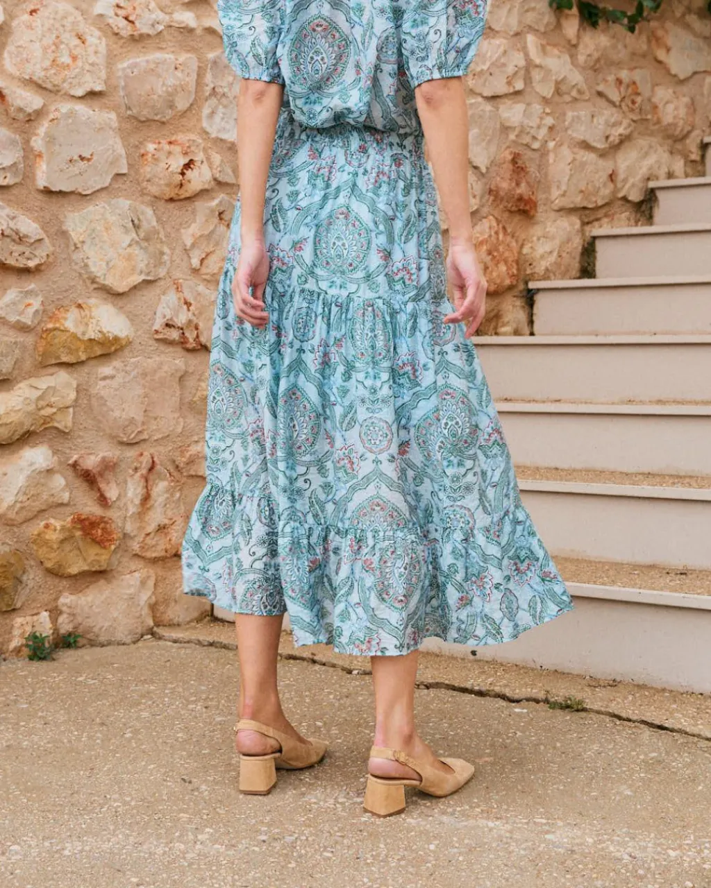 Jupe midi turquoise avec imprimer floral et motif de vol à volants. Sa taille élastique offre un confort et une coupe flatteuse.