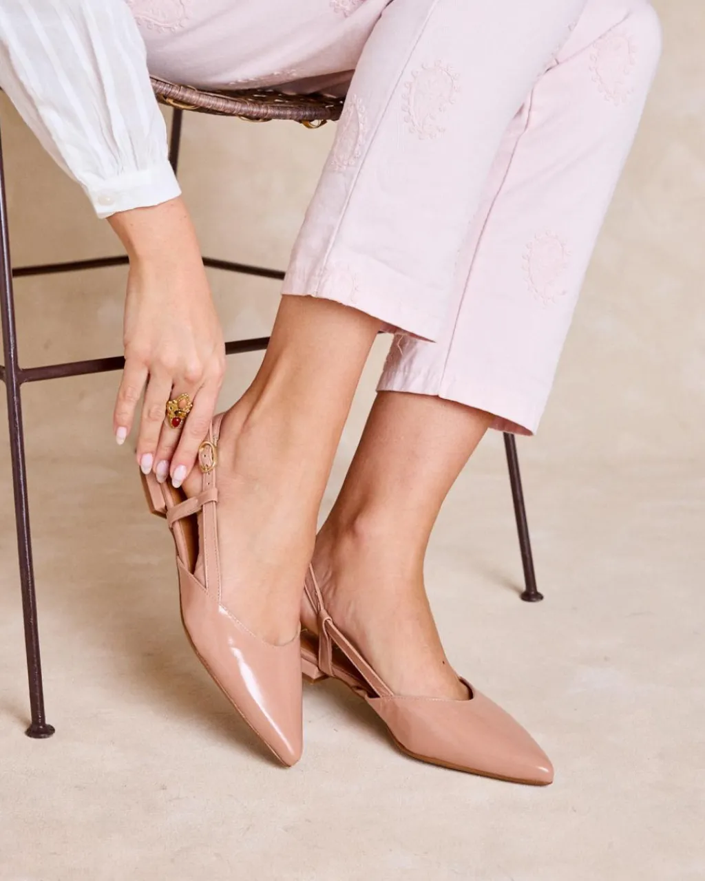 Ballerines escarpins à bride arrière beige. Bout pointu. Encolure arrondie. Bride avec boucle au talon. C’est une chaussure différente et confortable à combiner avec des pantalons et des robes. Conçu et fabriqué en Espagne.