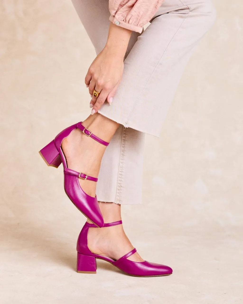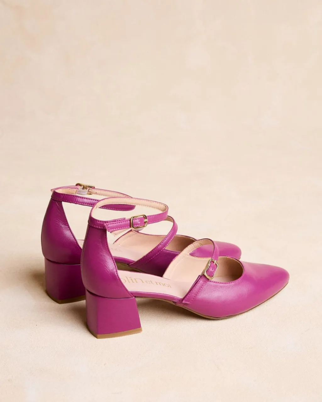 Mary Jane en cuir à Morad. Un modèle élégant de style parisien avec un extérieur en cuir, des épingles et des brides sur le cou-de-pied et la cheville et un bout légèrement pointu. Un talon moyen qui le rend spécial et unique et tout aussi confortable que les Mary Janes classiques, mais parfait pour ce printemps-été. Chaussures fabriquées en Espagne.
