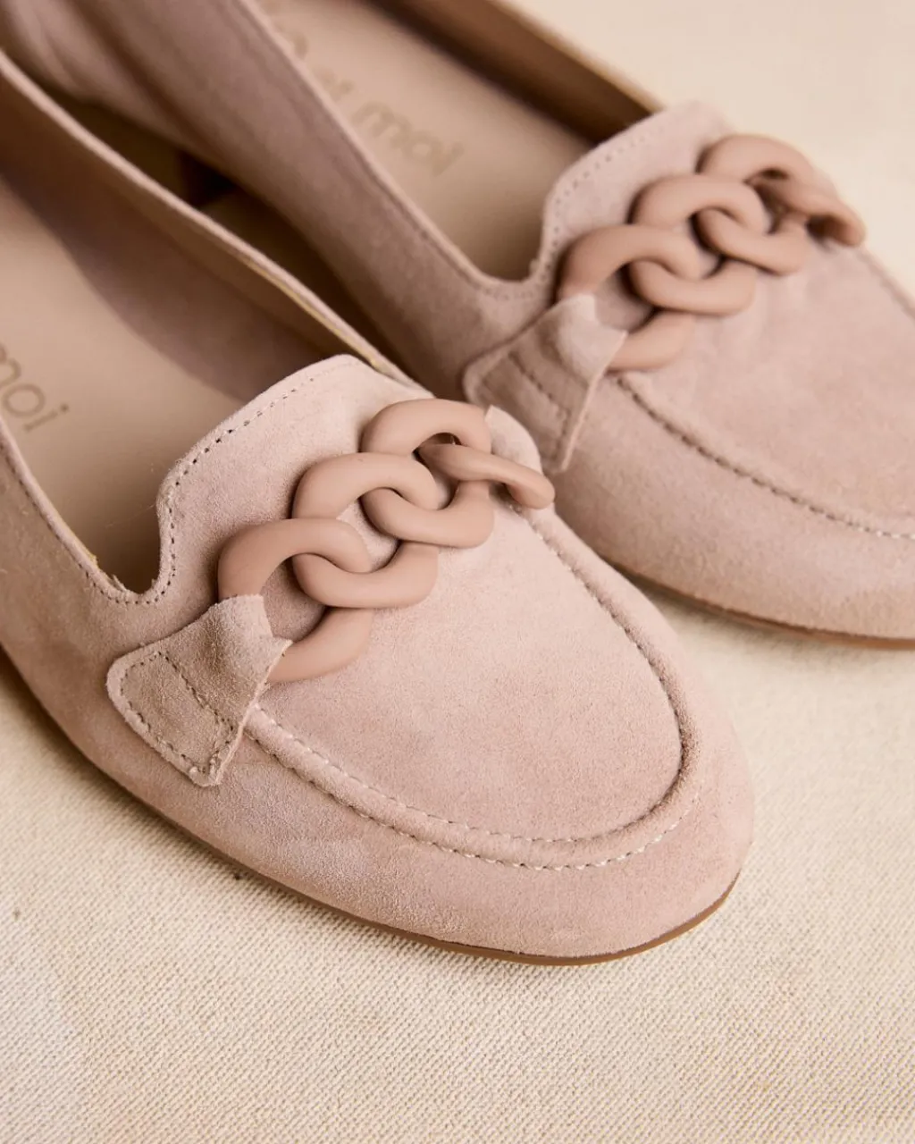 Mocassins en cuir velours couleur sable. Détail de chaîne en nacre sur le cou-de-pied. Bout légèrement arrondi. Des chaussures confortables pour toutes les occasions.