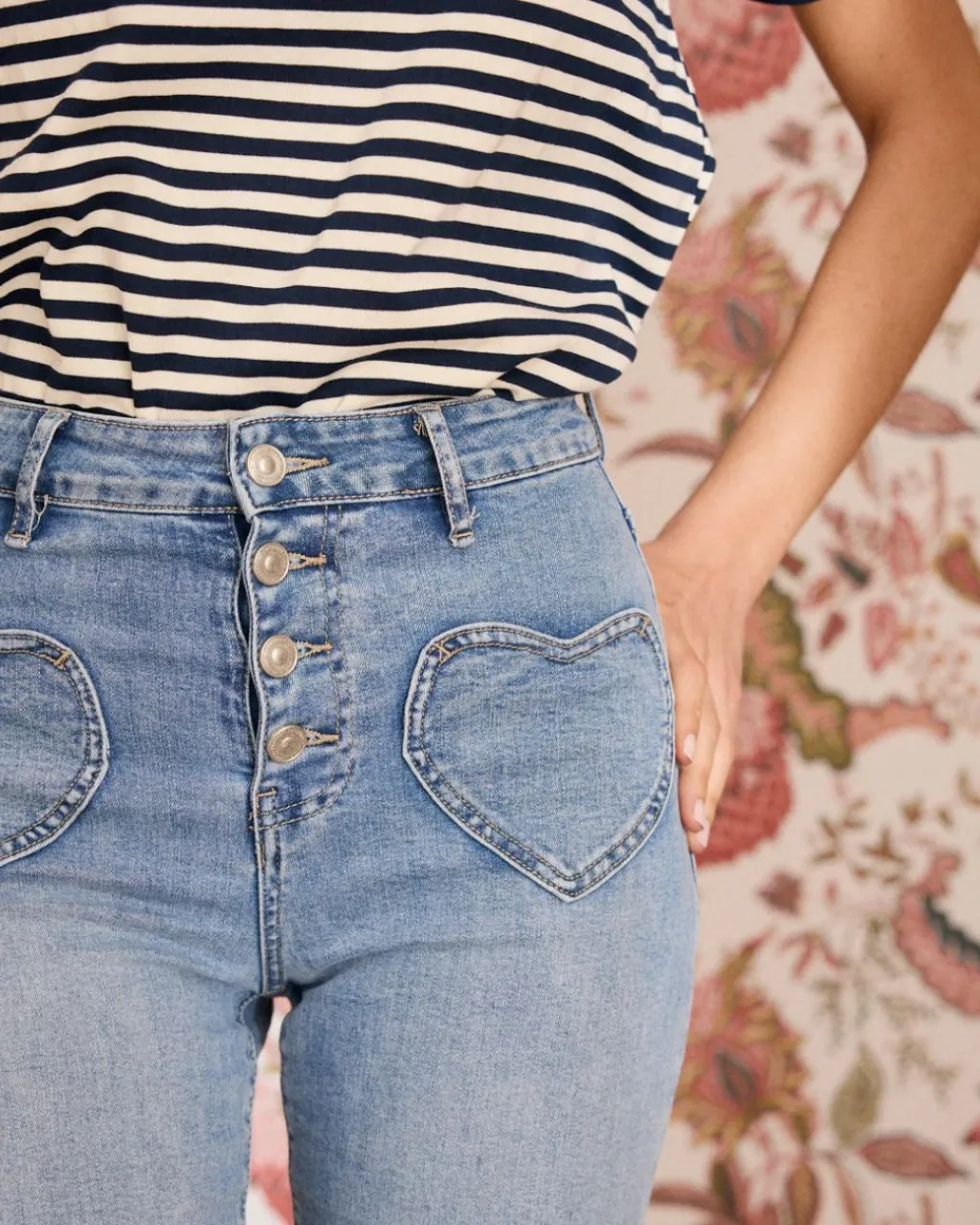 Jean coupe droite avec poches cœur. Parfait pour donner une touche différente à vos looks.