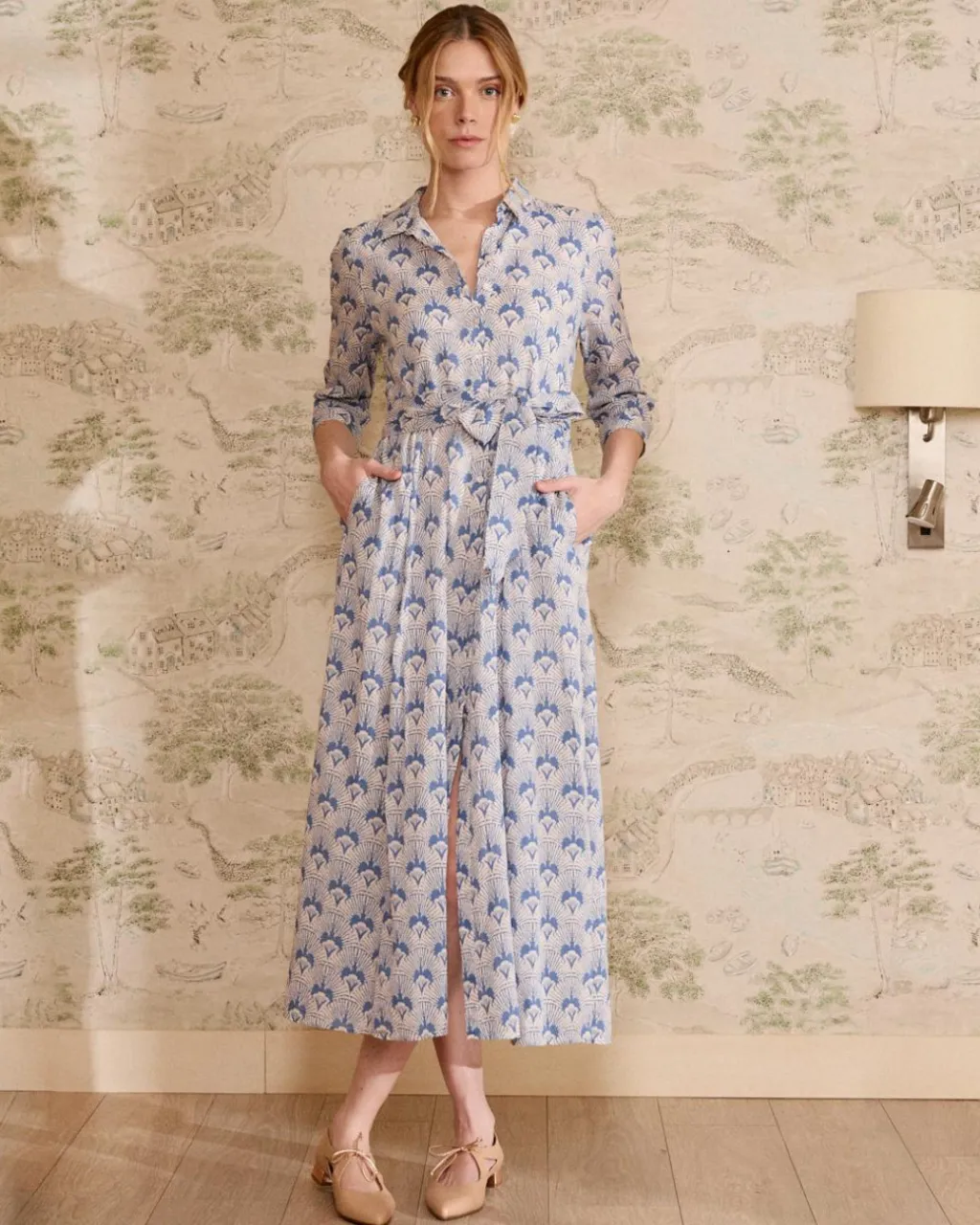 Robe midi avec chemise coupée de imprimer fleuris dans les tons bleus. Conçu avec des manches longues, des boutons sur le devant et une taille ajustable pour une silhouette flatteuse. Frais et polyvalent, idéal pour un look élégant et décontracté