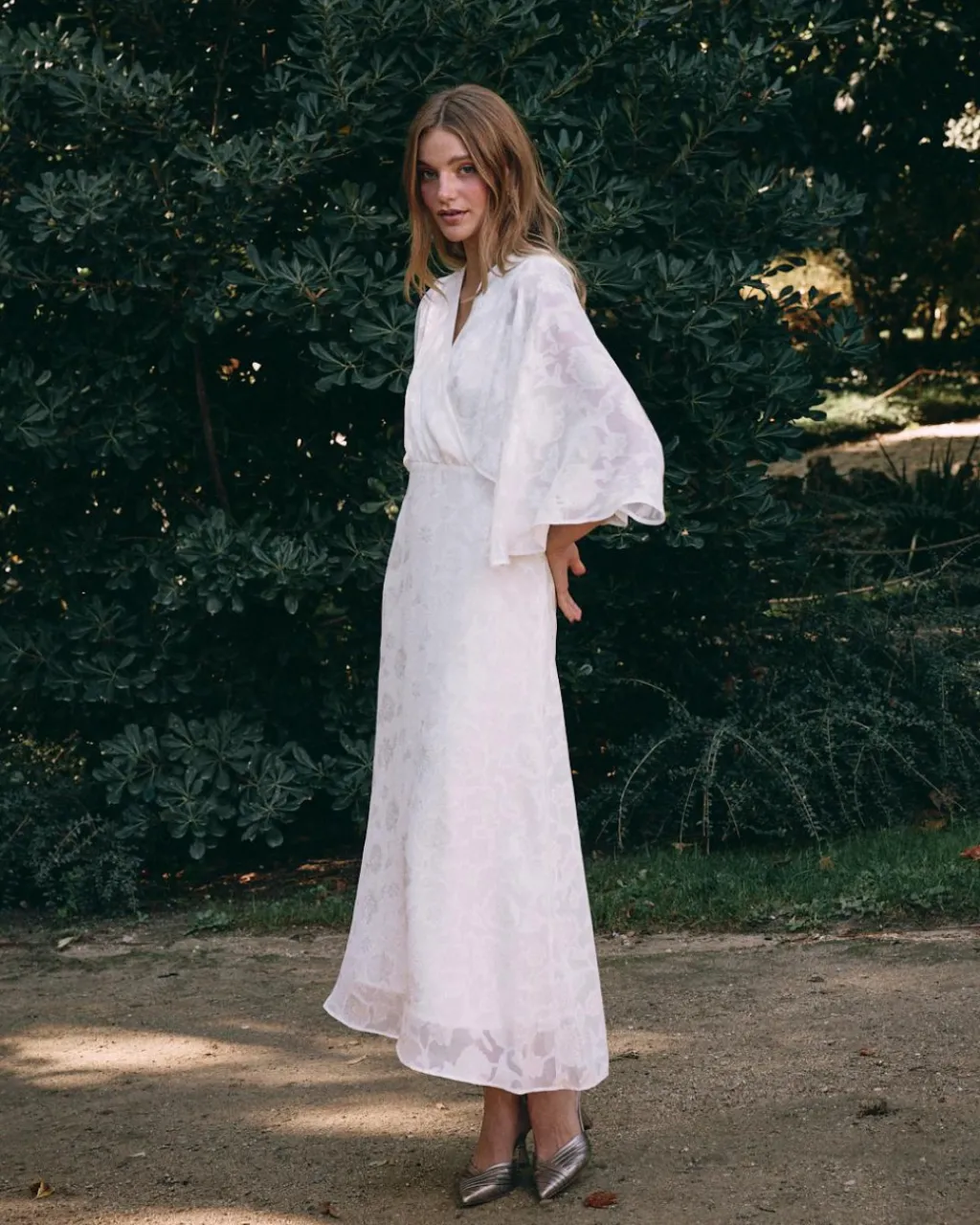 Robe mariée blanche. Confectionnée en tissu jacquard avec un décolleté en V et une découpe sous la poitrine ornée de petits plis, la robe allie élégance et confort. Les manches courtes façon chauve-souris ajoutent un air bohème, tandis que la jupe longue droite, avec une petite fente centrale, assure une liberté de mouvement. Comprend une doublure intérieure pour plus de confort.