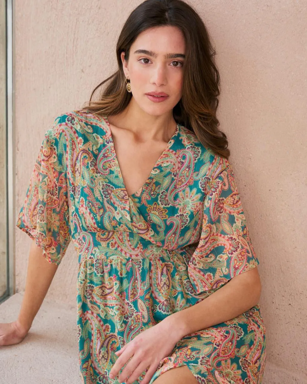 Robe longue vert émeraude avec imprimer floral, design fluide, encolure en V et manches courtes fluides.