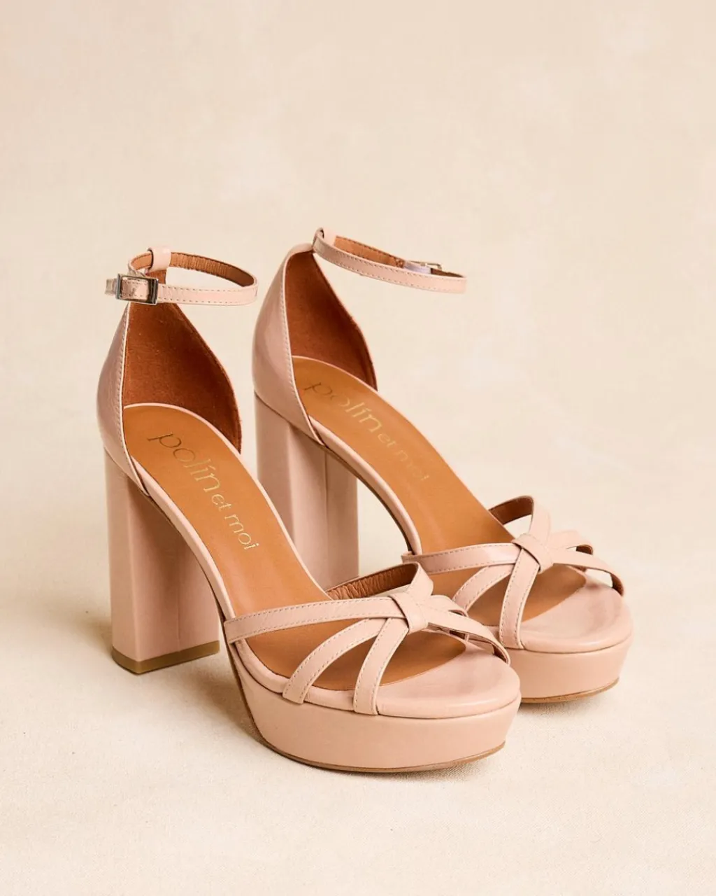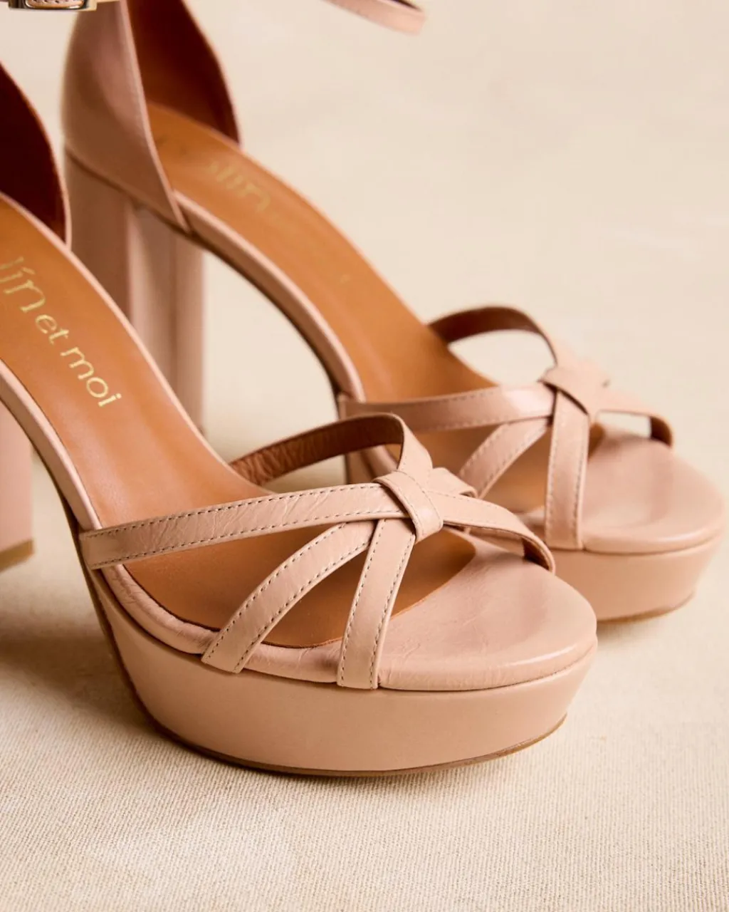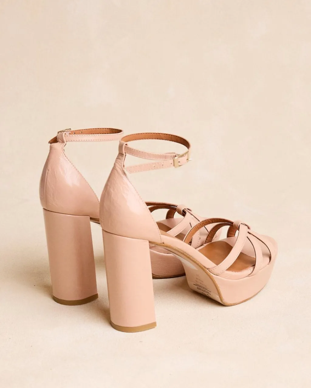 Sandale à talons arrière de couleur nude avec plusieurs rubans qui se croisent. Pointe arrondie. Fermeture de la cheville par sangle réglable avec boucle carrée. Talon large et plateforme pour plus de confort. Une chaussure très féminine et élégante pour le evénements de cette saison.