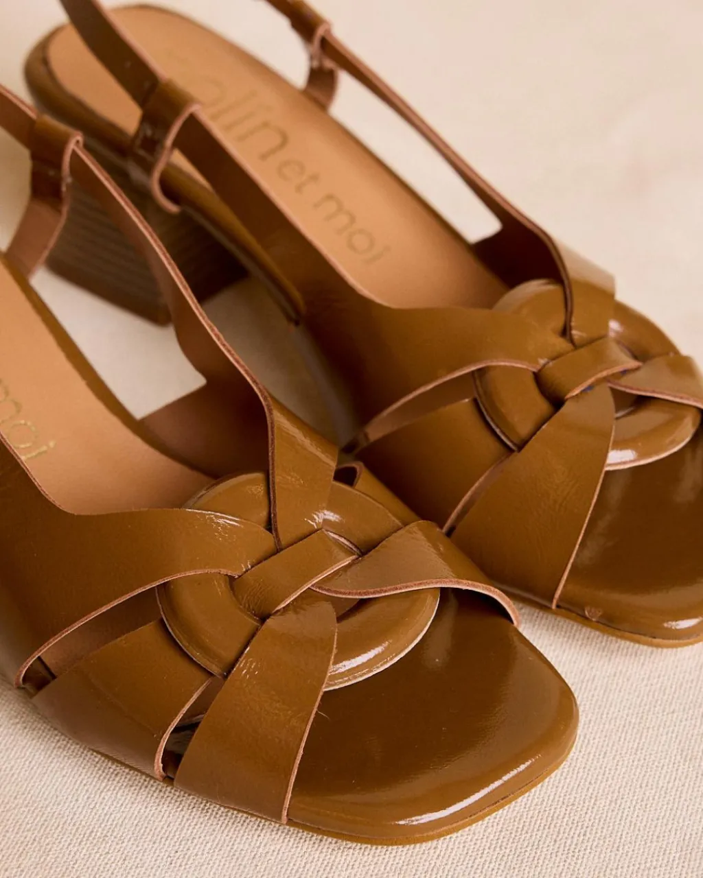 Sandales couleur cuir avec brides croisées et talon moyen large. Il est doté d’une fermeture à boucle à la cheville qui assure maintien et confort, parfaite pour un look décontracté avec une touche élégante.