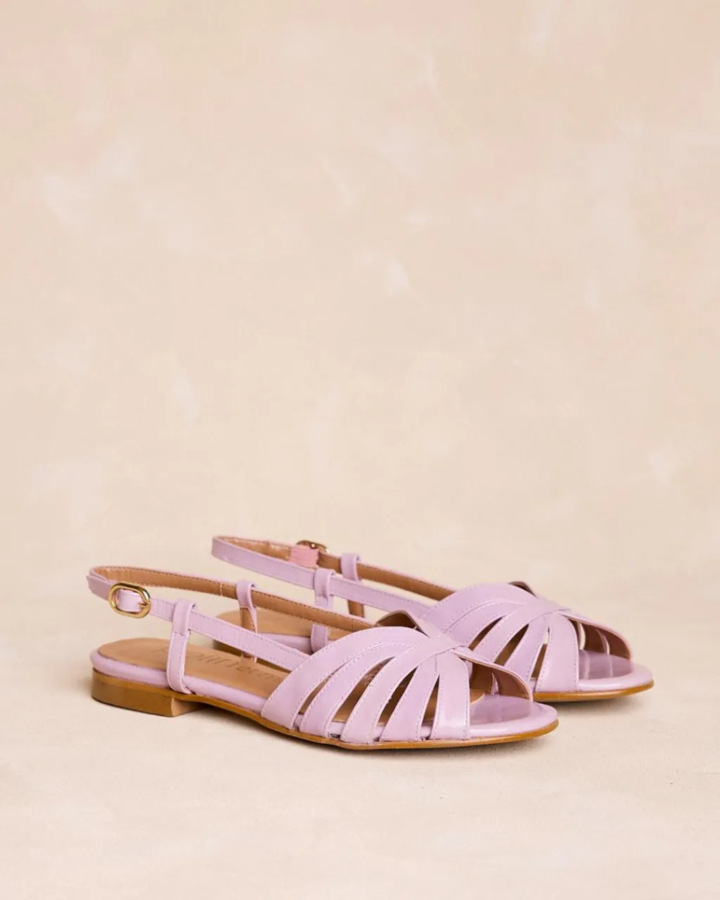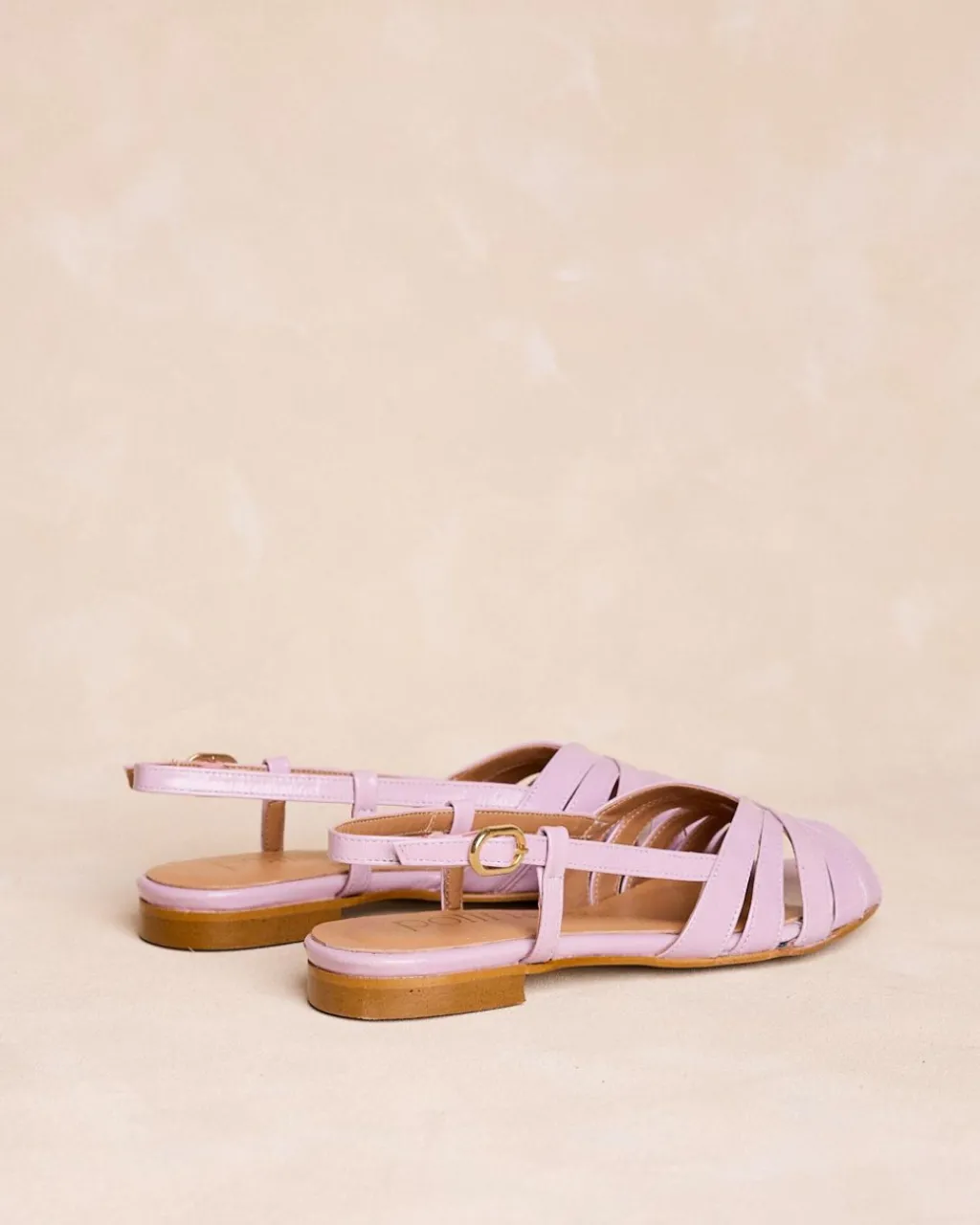 Sandale en cuir mauve. Design avec sangles entrelacées et bracelet ajustable avec boucle dorée. Son bout légèrement arrondi et sa semelle plate en font une option confortable et élégante à tout moment de la journée.