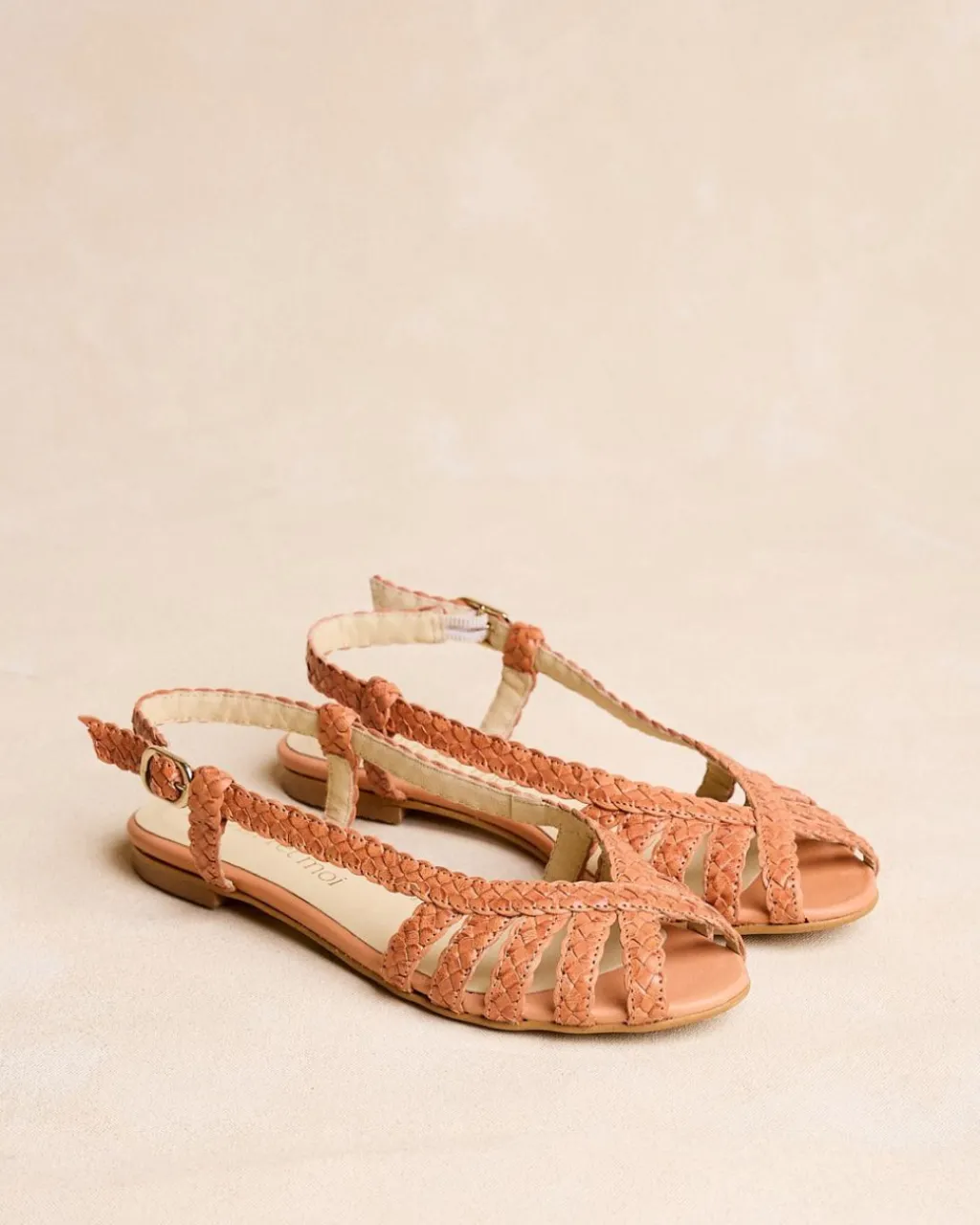 Sandale plate en cuir tressé orange. Bout ouvert et pointu. Ouvertures sur le cou-de-pied avec lanières en cuir tressé. Support de cheville avec fines sangles à boucle. La semelle intérieure est dotée d’un coussinet pour plus de confort. Une sandale pour rehausser n’importe quel look cette saison.
