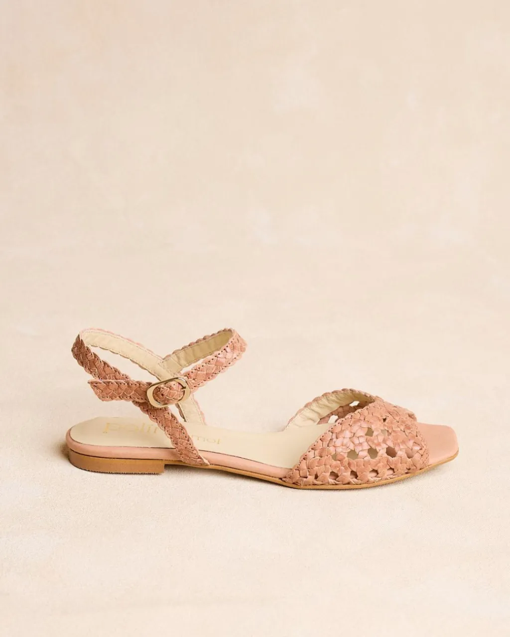 Sandale en cuir camel avec finition tressée. Encolure en forme de papillon. Bout légèrement carré avec ouverture. Soutien de la cheville par une bride tressée avec boucle pour un ajustement confortable. C’est une sandale idéale et confortable à combiner cette saison avec vos vêtements préférés.
