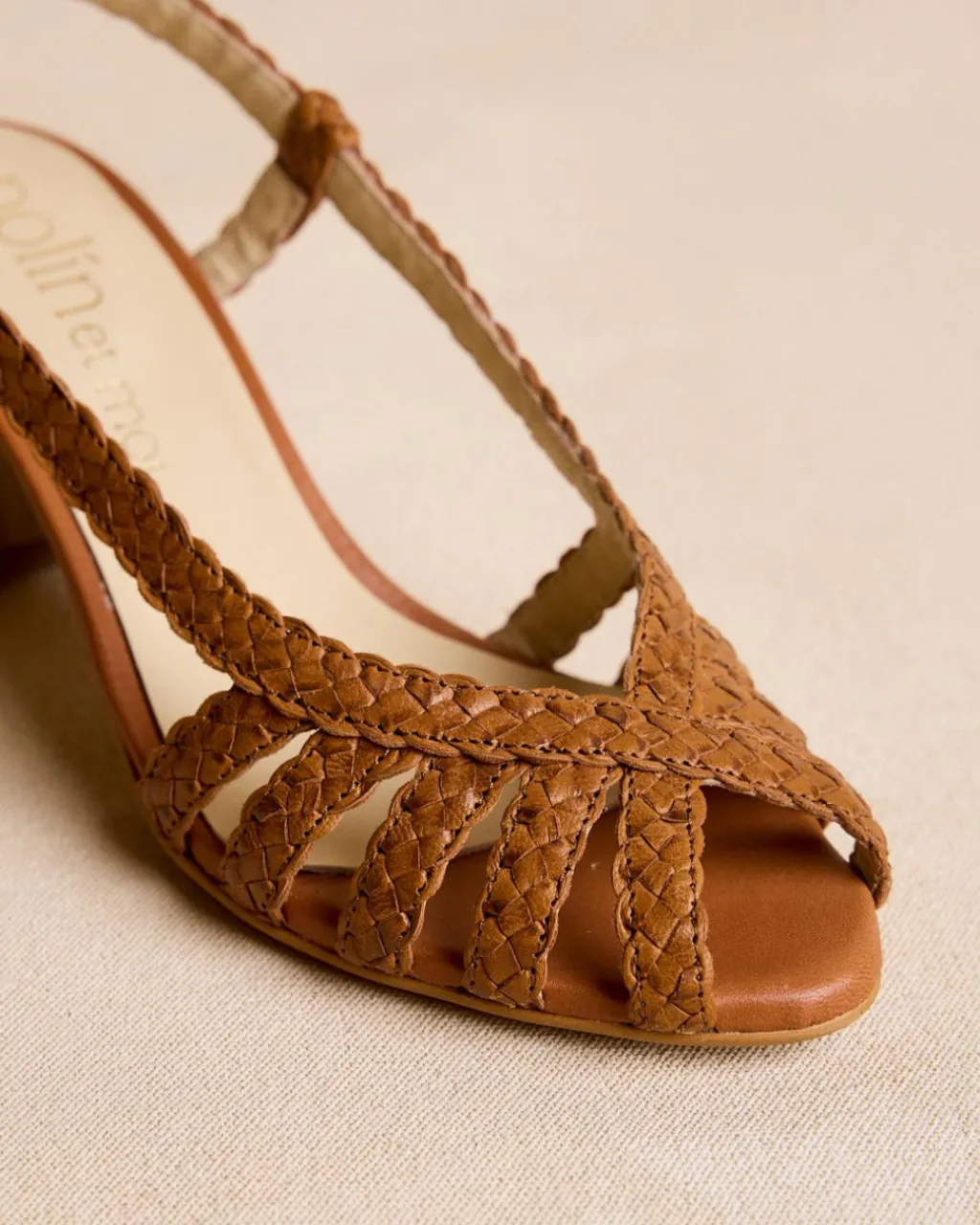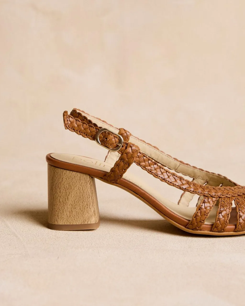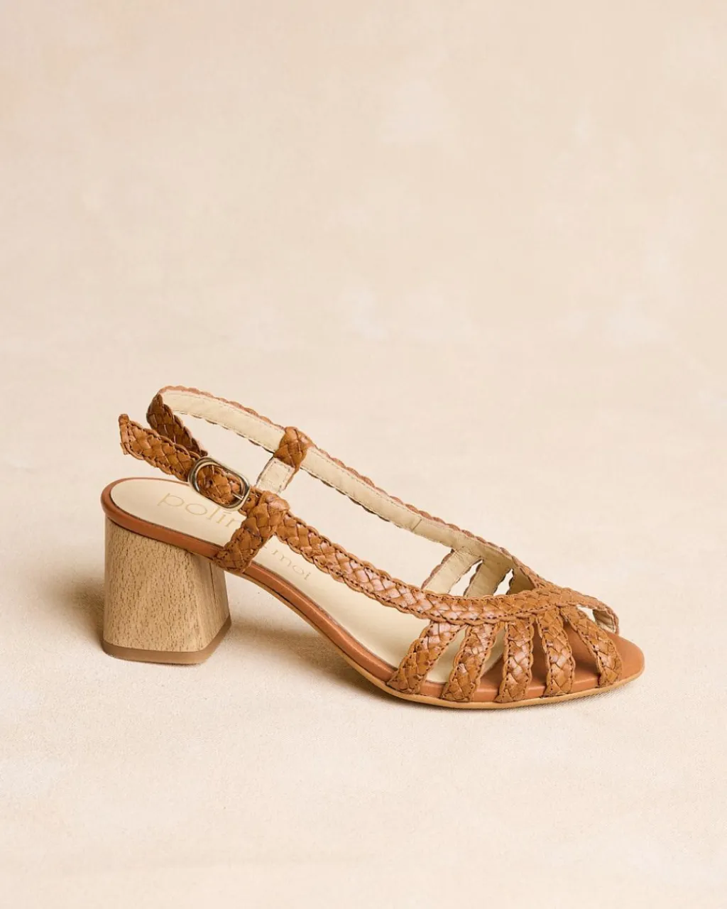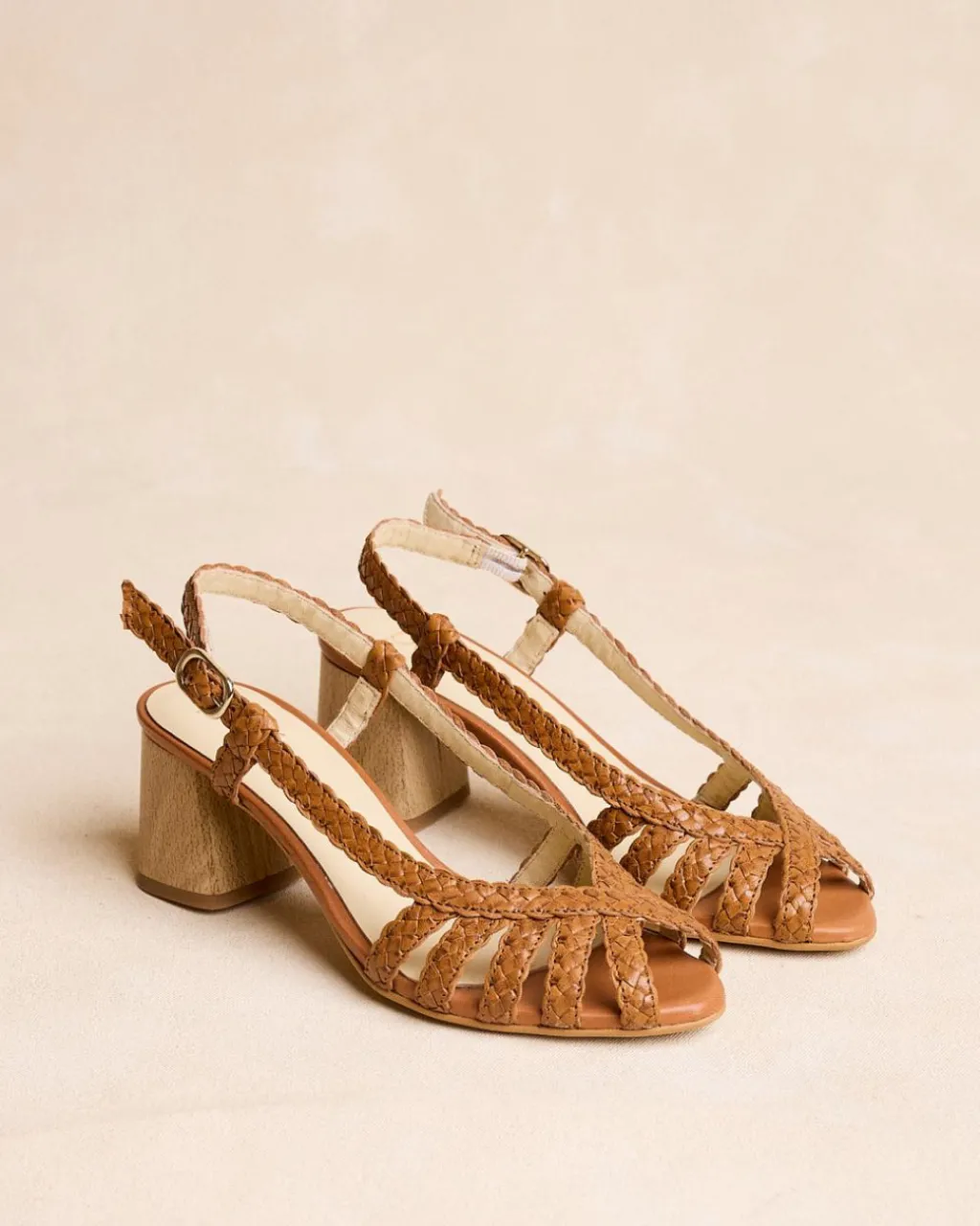 Sandale en cuir tressé de couleur cuir. Bout arrondi avec détail de ruban tressé croisé. Talon fermé par une bride en cuir avec boucle. Talon carré en bois. Une sandale très spéciale et élégante pour cette saison.