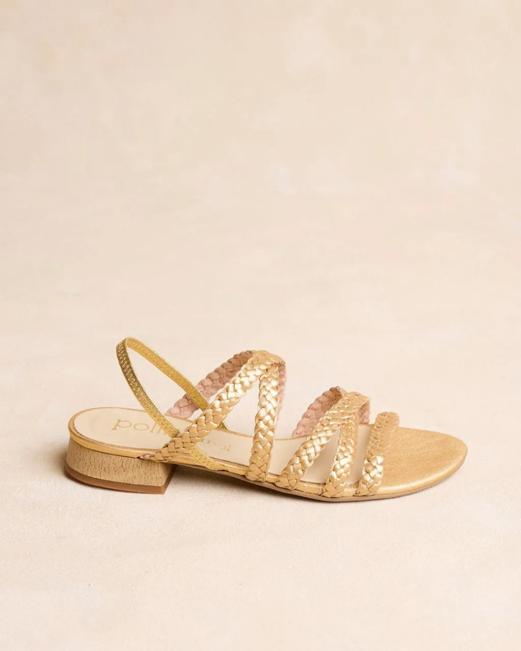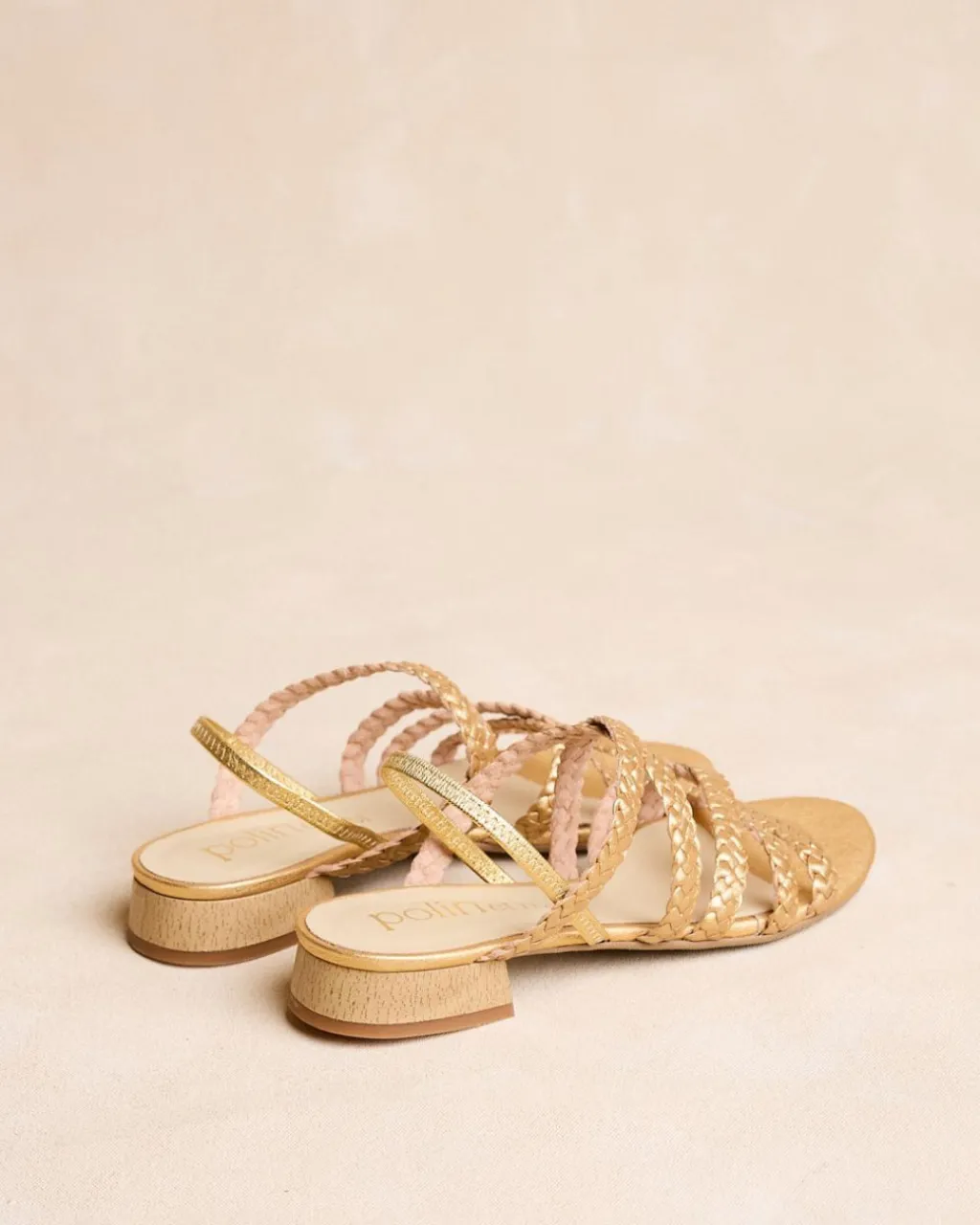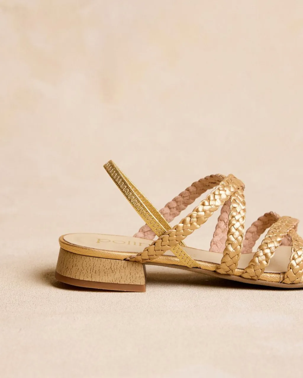 Sandale en cuir tressé doré. Encolure avec rubans tressés croisés en orange, blanc et camel. Talon fermé par une bride en cuir élastique de couleur camel pour un ajustement confortable. Une sandale aux couleurs très spéciales et polyvalentes pour cette saison.