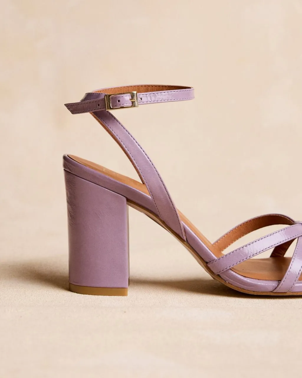 Sandale à talon lilas. Pointe carrée aux coins légèrement arrondis. Encolure avec trois rubans croisés. Fermeture de la cheville par sangle réglable avec boucle carrée. Une chaussure élégante et confortable.