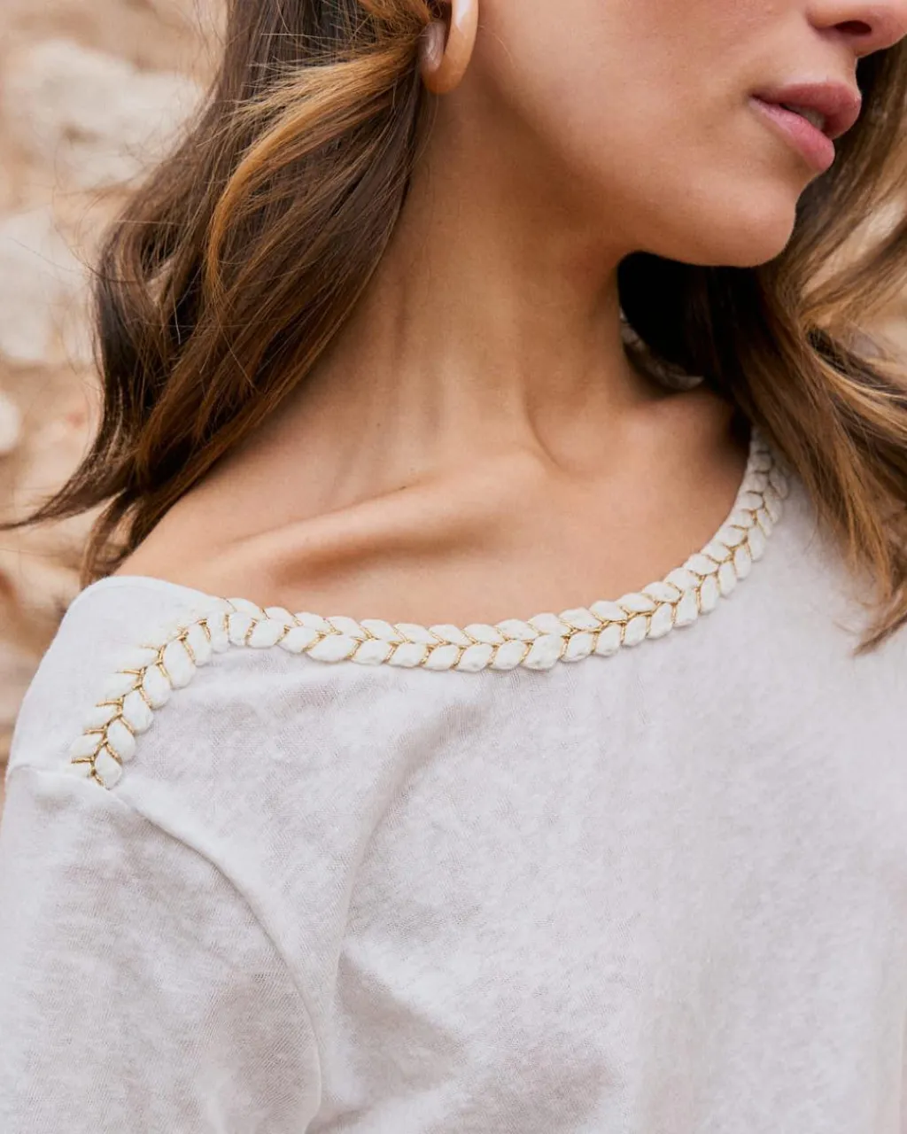 T-shirt à manches courtes en blanc avec un délicat détail de broderie sur l’encolure, ajoutant une touche sophistiquée au design. Sa coupe ample et son tissu léger le rendent idéal pour un look frais et polyvalent.