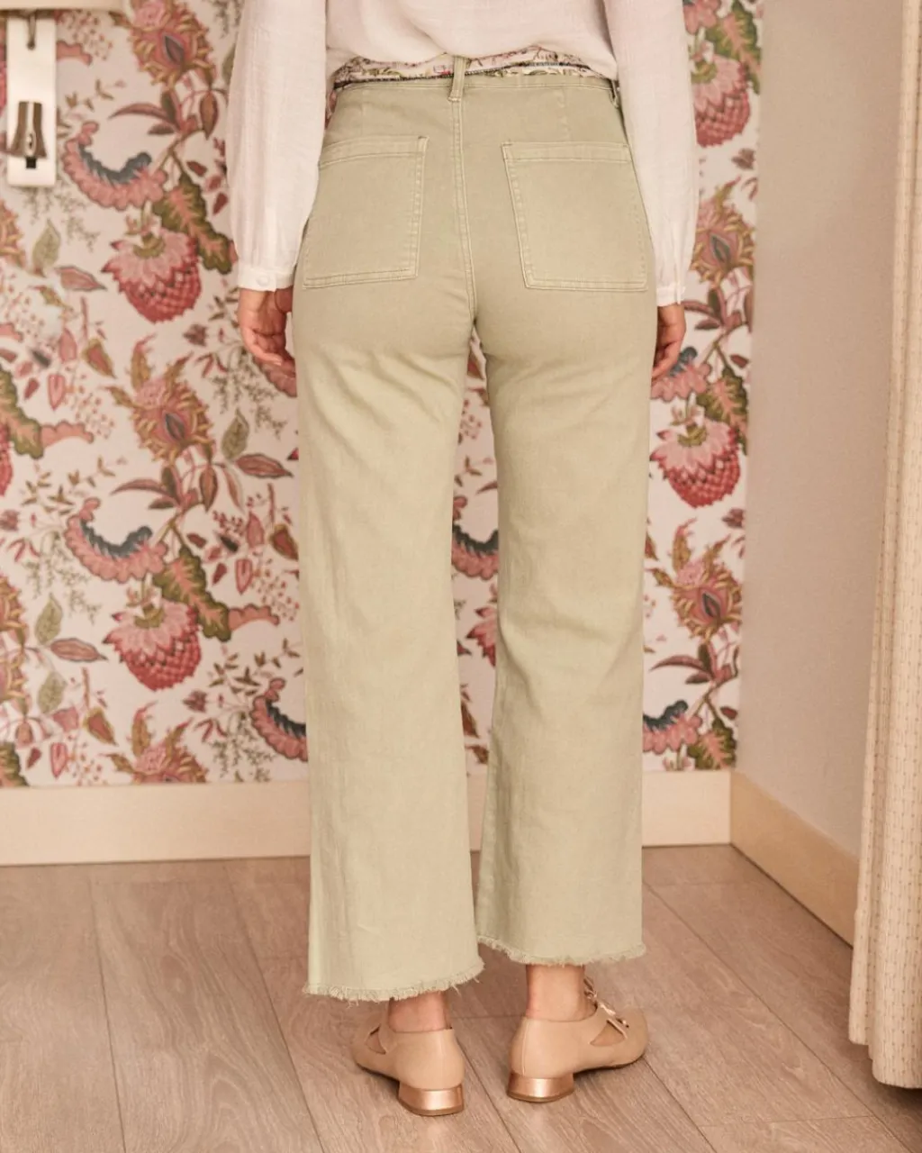 Pantalon droit couleur eucalyptus avec coupe cheville, taille haute avec détail écharpe nouée
