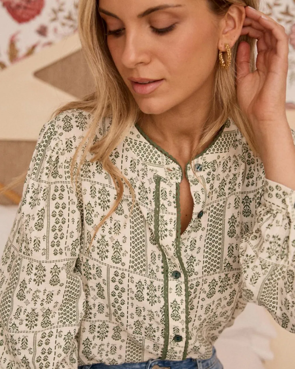 Blouse à imprimer vert dans les tons écrus avec rangée de boutons, col fermé et manches longues.