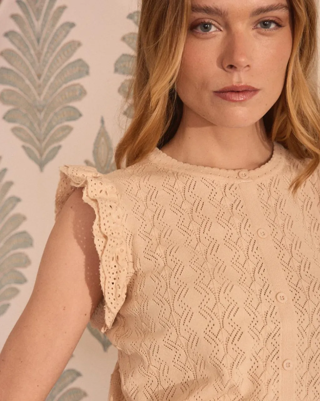 Haut beige à texture ajourée, manches courtes à volants et détail élastique à la taille.