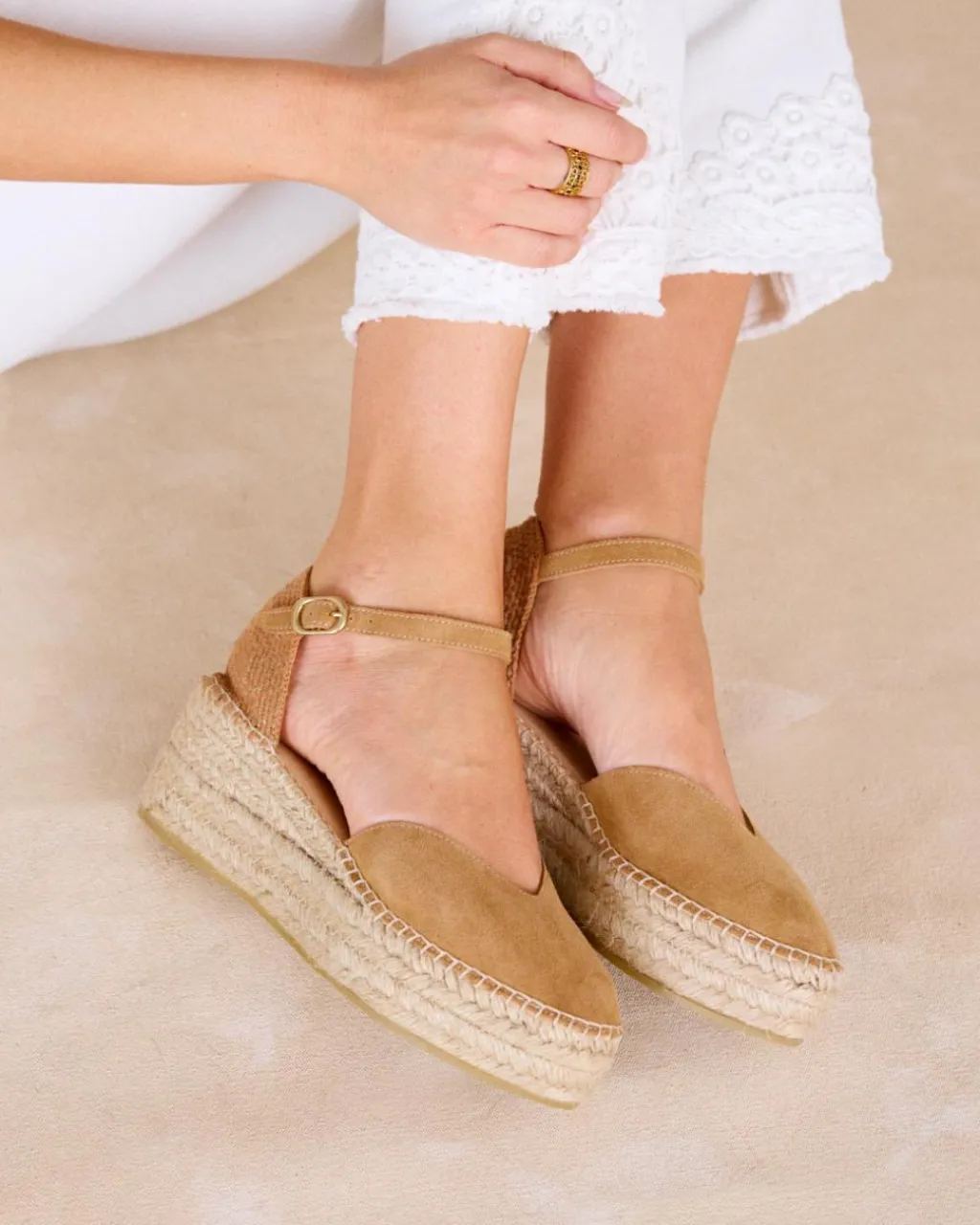 Espadrille plateforme couleur camel. Pointe légèrement pointue. Fermeture à la cheville par boucle. Décolleté en cœur. Fabrication espagnole de jute naturel. La semelle intérieure est dotée d’un coussinet pour plus de confort. Une espadrille parfaite pour toute la journée et idéale à combiner avec votre jean préféré.