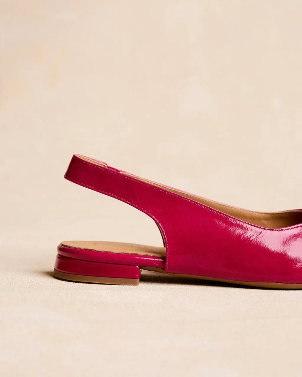 Ballerines de couleur framboise avec une finition vernie et un design à bride arrière. Il dispose d’un support avec une sangle élastique à l’arrière qui offre un confort et un ajustement parfait. Son bout pointu ajoute une touche élégante et sophistiquée, idéale pour les looks décontractés ou plus formels. Chaussures conçues et fabriquées en Espagne.
