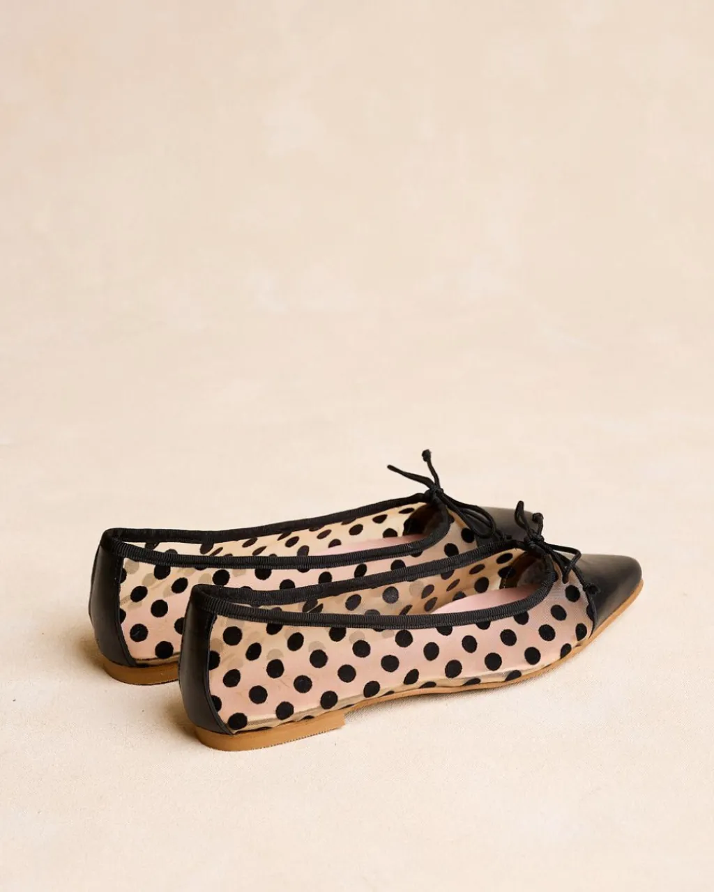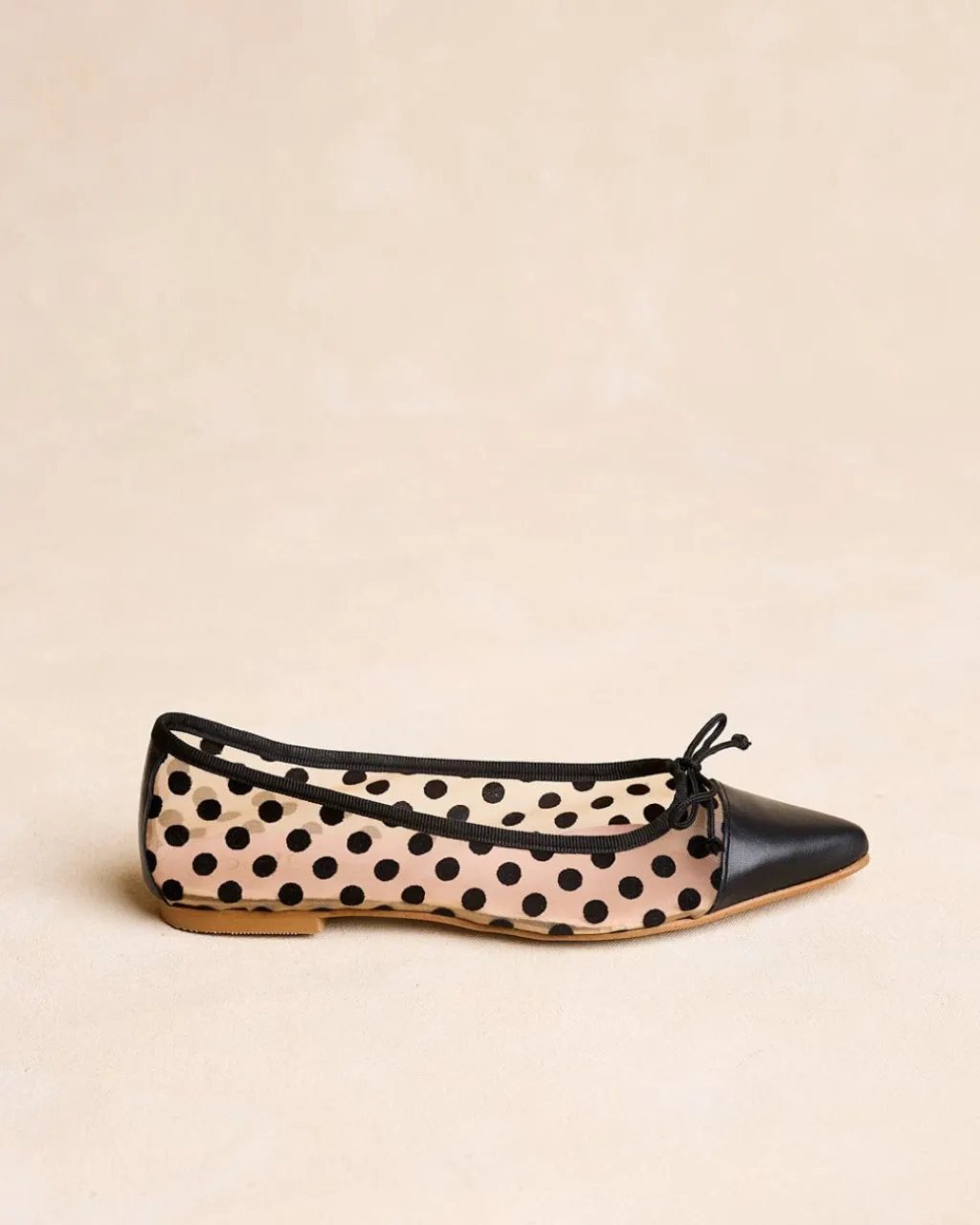 Ballerines noir avec un motif en maille transparente et des pois contrastés. Il est doté d’une pointe pointue avec une finition en cuir noir et d’un délicat nœud décoratif sur le devant. Sa semelle plate et sa structure légère la rendent idéale pour un look sophistiqué et confortable au quotidien.