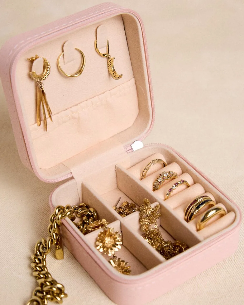bijoutier carré de couleur maquillage avec des compartiments rembourrés, une fermeture sécurisée et une taille parfaite pour ranger des bijoux à la maison ou en déplacement.