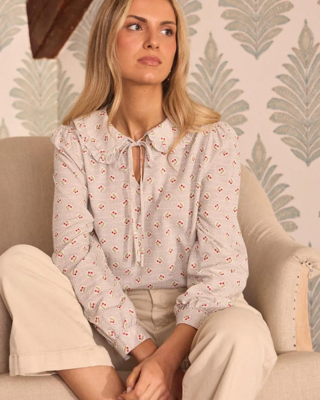 Blouse blanche avec imprimer cerise, manches longues, rangée de boutons et col idiot.