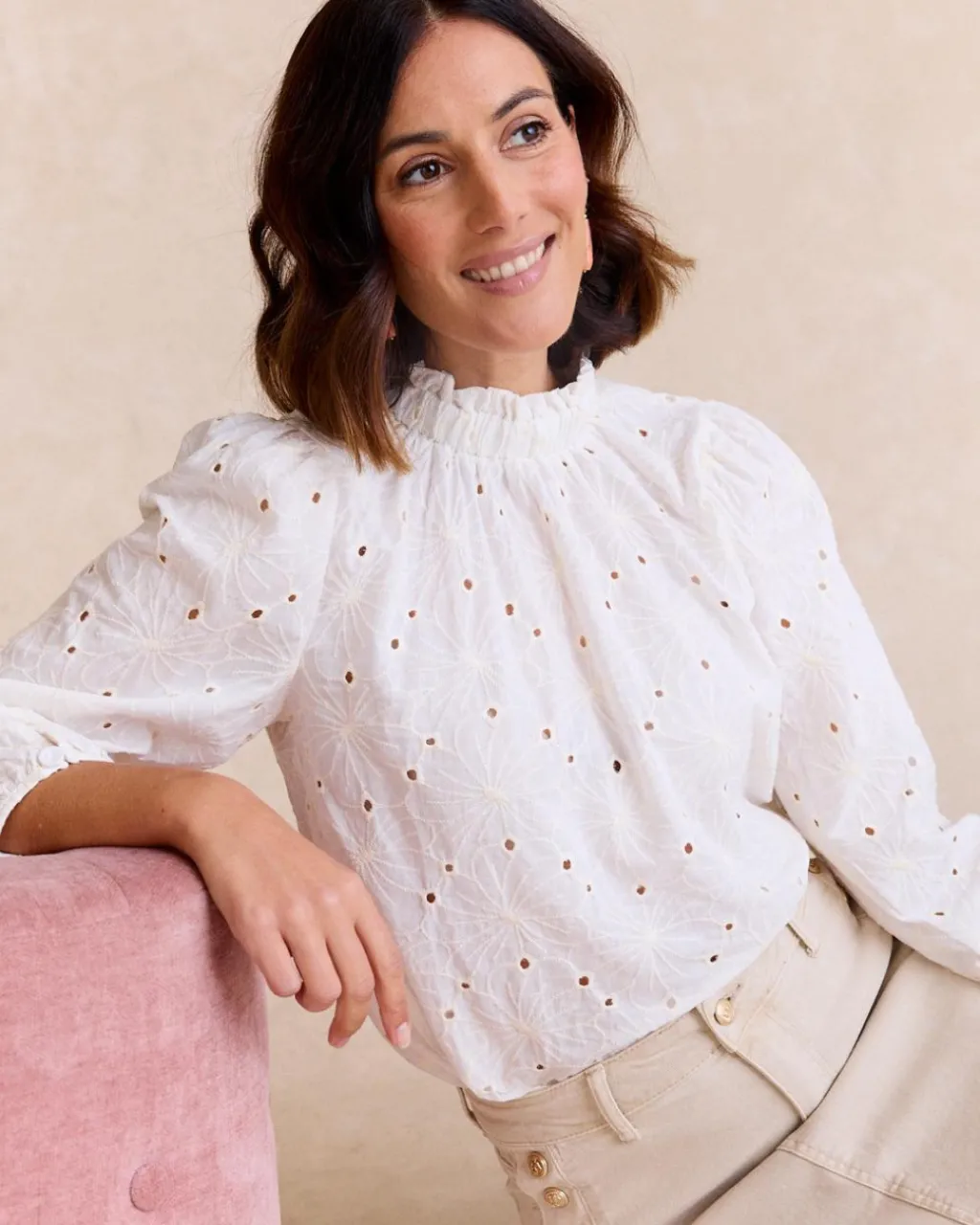 Élégant chemisier de style romantique en tissu léger et délicat avec des détails brodés qui ajoutent une touche spéciale. Ce vêtement est doté d’un col roulé froncé, qui ajoute de la sophistication au design, et de longues manches bouffantes avec un tombé doux, ce qui le rend idéal pour un look féminin et polyvalent.