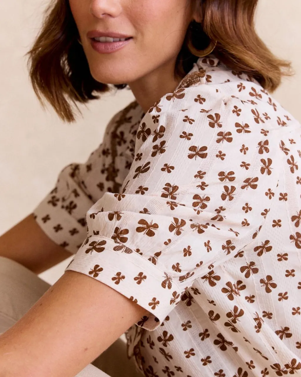 Chemisier de style vintage avec des imprimer floraux dans les tons bruns sur un fond beige clair. Il se distingue par ses élégants détails de volants sur le cou et la poitrine, créant un effet romantique et féminin. Le design comprend des manches amples à hauteur de coude qui offrent confort et fraîcheur, idéales pour toute occasion décontractée ou semi-formelle.