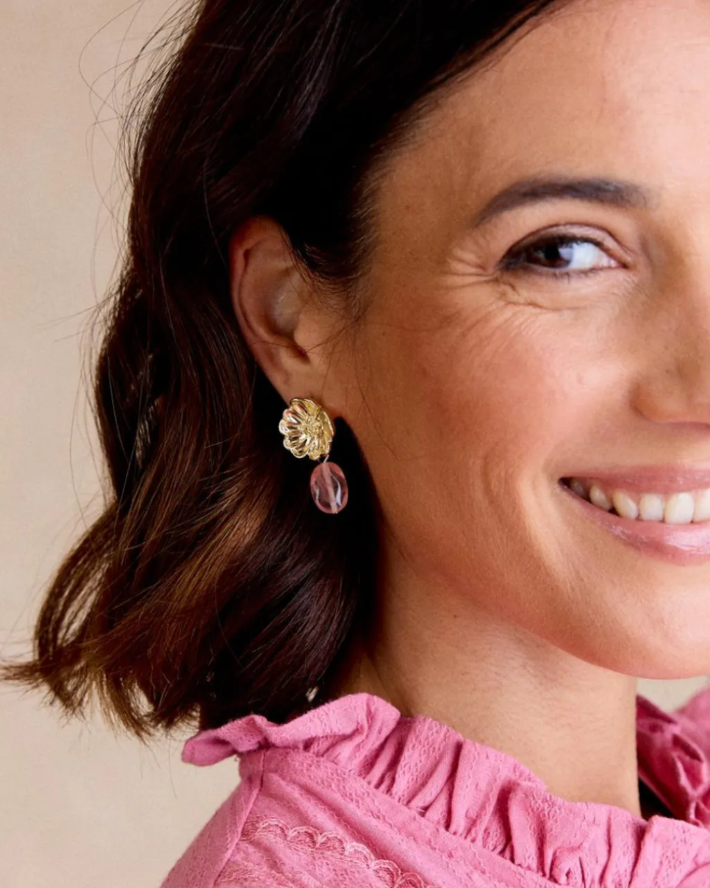 Boucles d’oreilles en forme de fleur dorée et d’une pierre suspendue rose, idéales pour ajouter une touche délicate à vos looks.