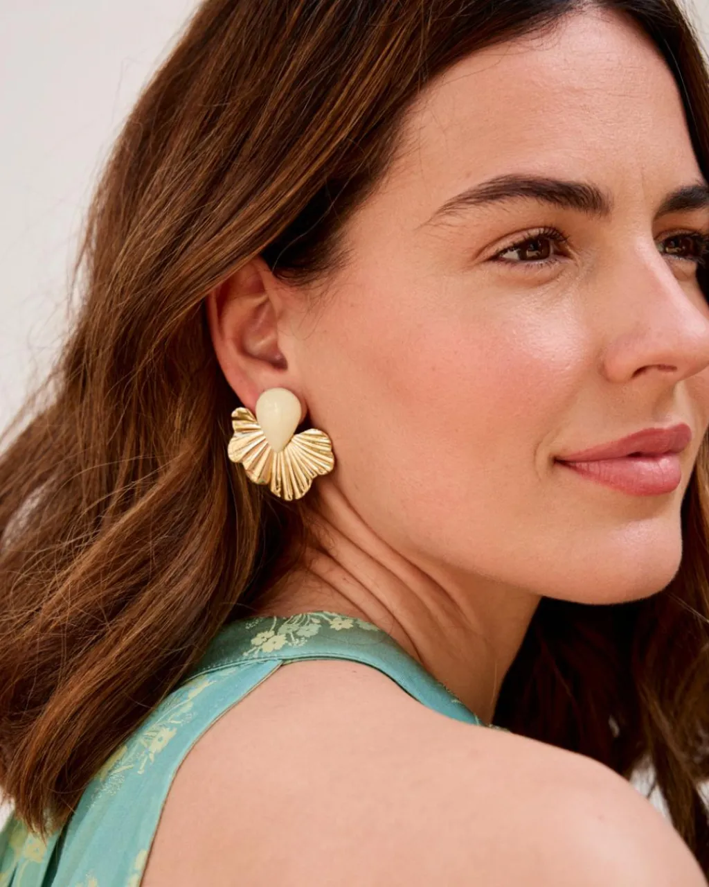 Petites boucles d’oreilles avec une base dorée et un détail en forme de goutte d’eau blanche.