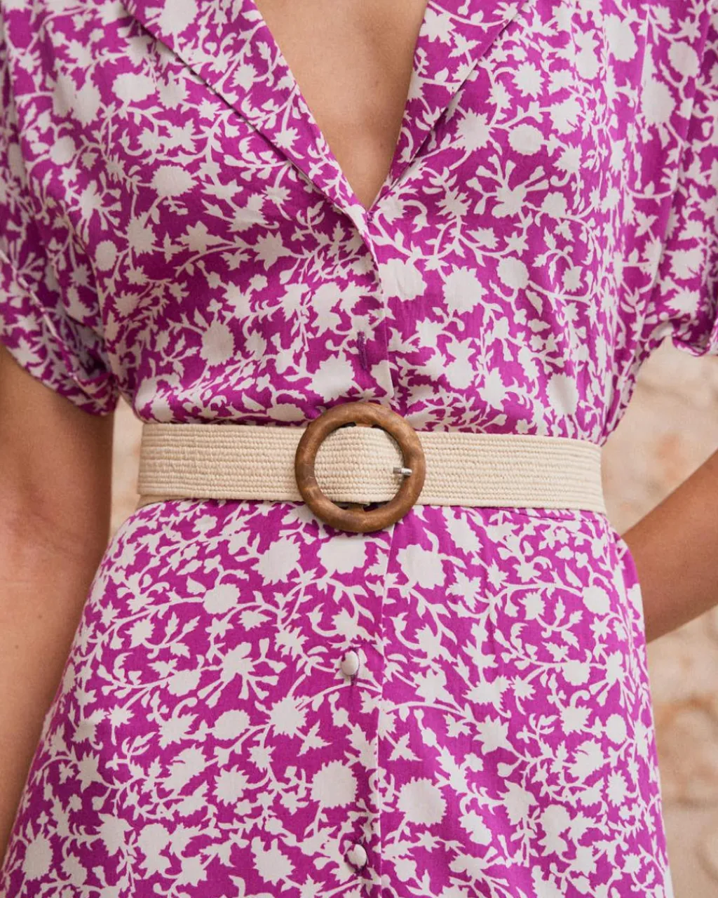 Ceinture en raphia avec boucle ronde de couleur beige.