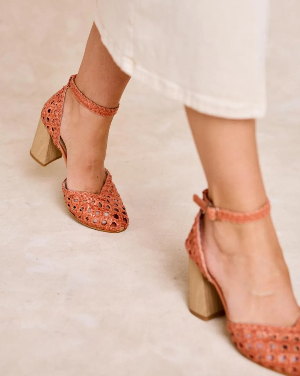 Chaussure en cuir tressé de couleur orange. Pointe pointue légèrement arrondie. Décolleté en forme de cœur. Fermeture de la cheville par sangle réglable avec boucle carrée. Talon large. Une chaussure très féminine et confortable. Ils s’adaptent normalement. Si vous hésitez entre deux tailles, nous vous conseillons de choisir la taille supérieure.