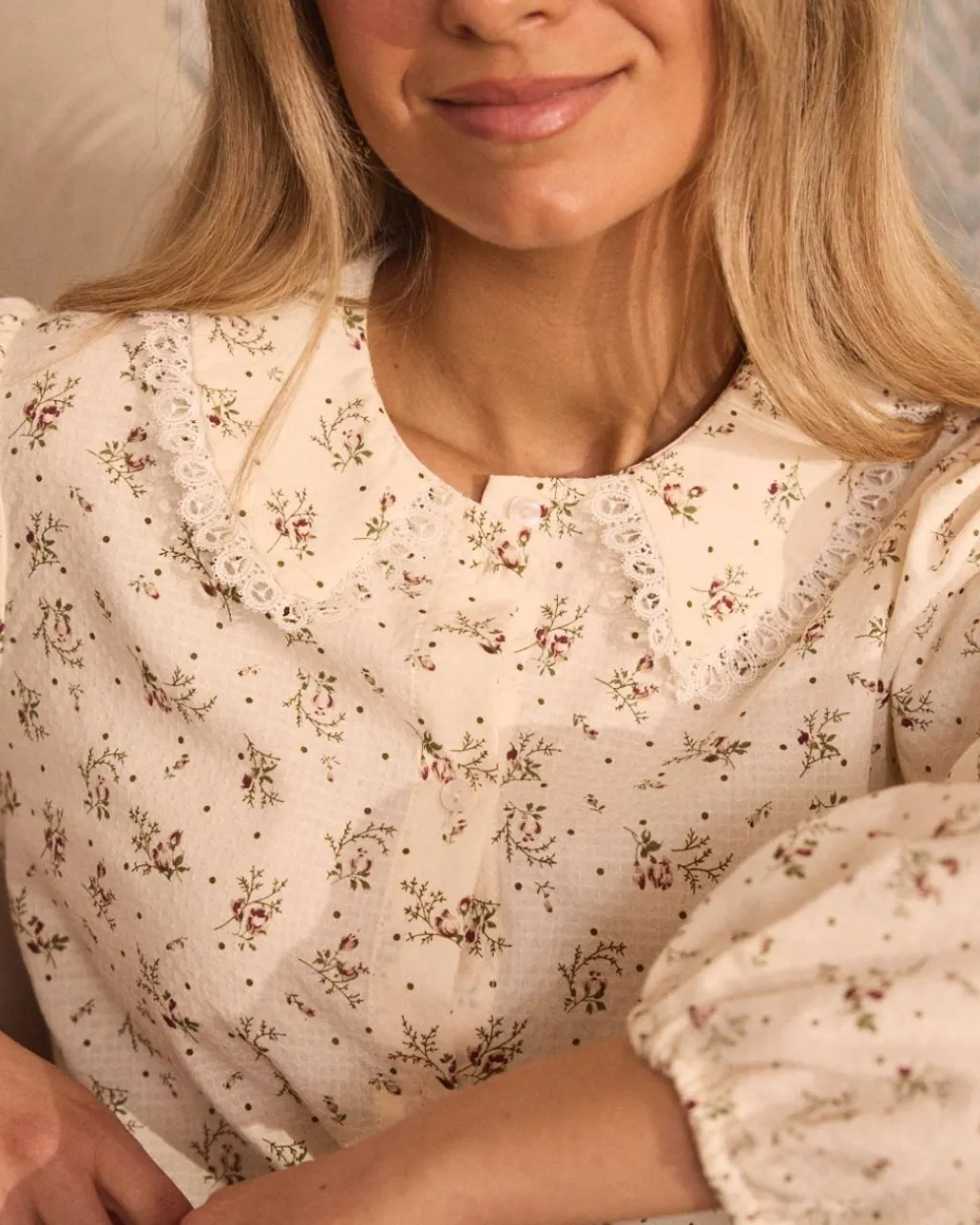 Chemise écrue à imprimer fleurie, détail à volants sur le col, rangée de boutons et manches longues.