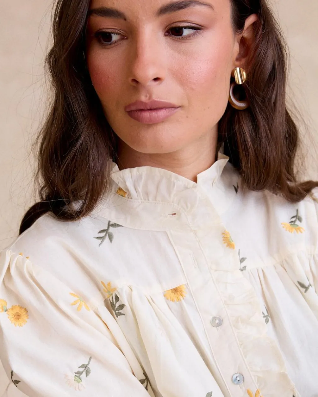 La chemise écrue présente une délicate imprimer florale associée à des feuilles, créant un look frais et naturel. Son col à volants ajoute une touche féminine et sophistiquée, tandis que la coupe douce et le tissu assurent un confort tout au long de la journée. Idéal pour un style romantique et élégant.
